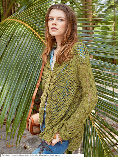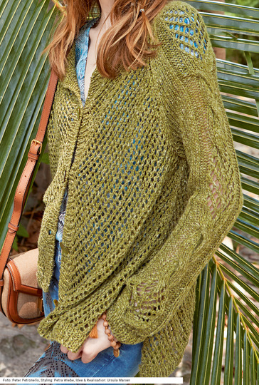Tauche ein in die kunstvolle Welt des Strickens mit unserer grünen Strickjacke in A-Form. Mit Netzstrukturen und Zopfstreifen verleiht sie der ausgestellten Silhouette eine elegante Note. Die Raglanärmel und die raffinierte Schnittführung machen diesen Cardigan zu einem Meisterwerk für erfahrene Strickerinnen. Entdecke die Klasse und Raffinesse dieses zeitlosen Stücks, das mit seiner anspruchsvollen Musterführung und sorgfältigen Verarbeitung selbst die erfahrensten Handarbeitsliebhaber begeistern wird.