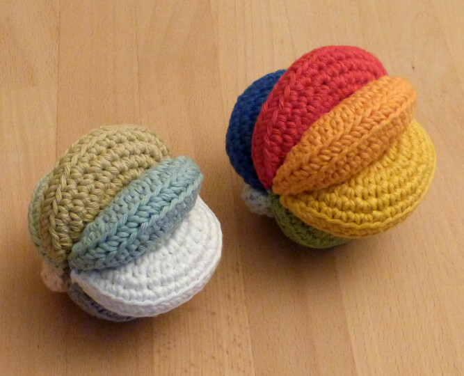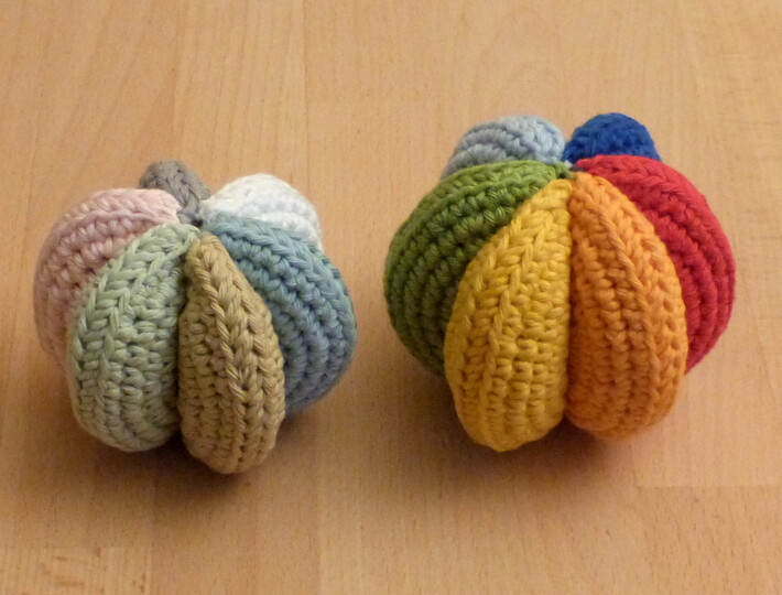 Bei Verwendung von Baumwollgarn mit einer Lauflänge von ca. 90m/50g und Nadelstärke 3,5 bekommt der Greifball einen Durchmesser von 7 bzw 8 cm. Das fertige Spielzeug ist geeignet für Kinder ab ca. 6 Monaten.