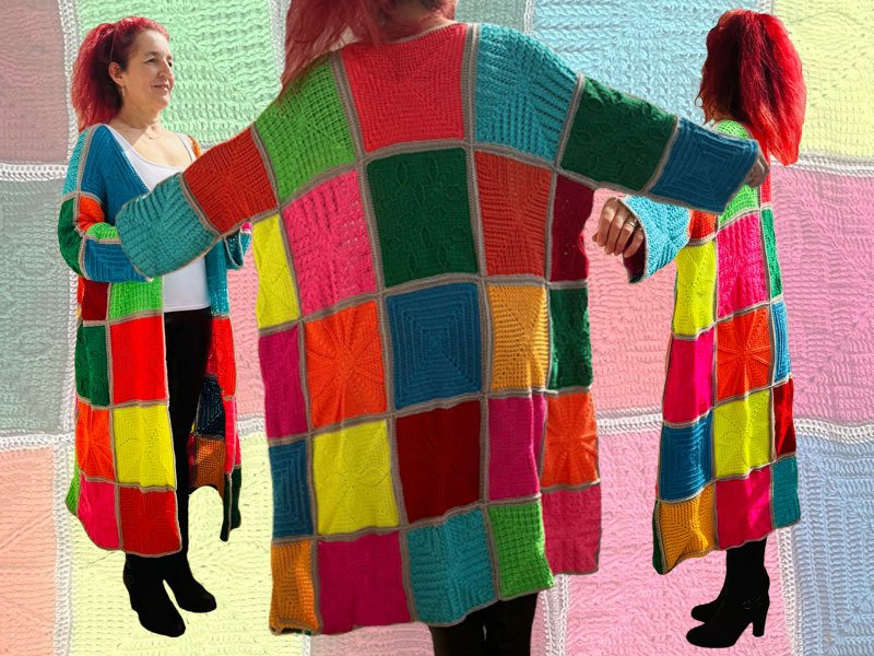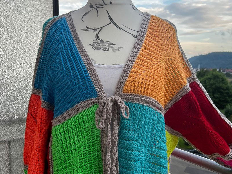 Der Mantel besteht aus mehreren unterschiedlichen Grannys, die zusammen gehäkelt werden.
