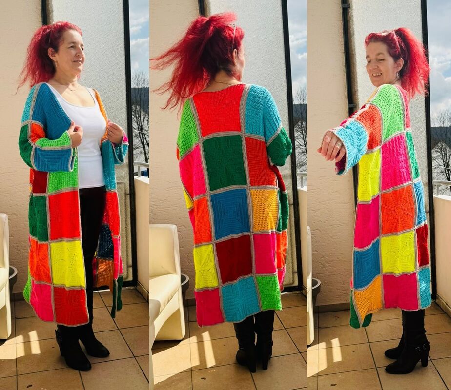 Mein Mantel ist ein weiter Hippie Mantel mit Regenbogenfarben und Neonfarben. Colorful kann auch als Mantel oder Jacke mit normaler Passform gehäkelt werden. Ich habe meinen Mantel bewusst weit gemacht.