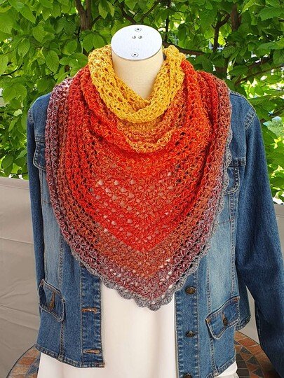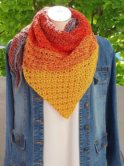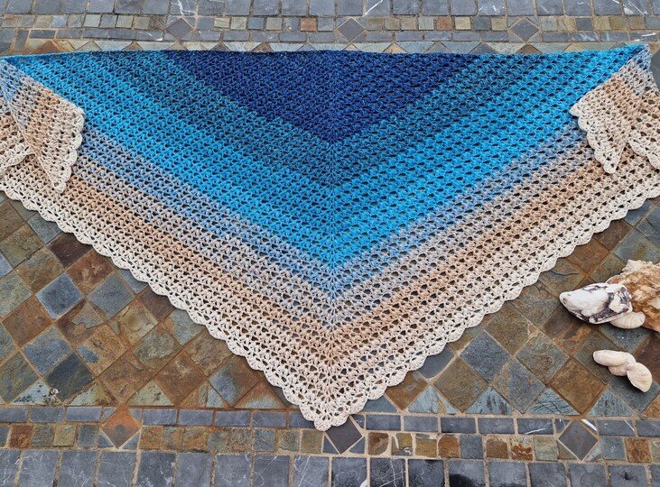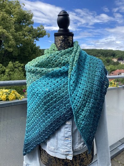 Du kannst das Tuch mit beliebigem Garn häkeln. Die benötigte Garnmenge ist abhängig von der Wunschgröße, dem gewählten Material und deinem persönlichen Häkelstil. Bei Farbverlaufsgarn empfehle ich eine Lauflänge ab 1200 m 3-fädig.