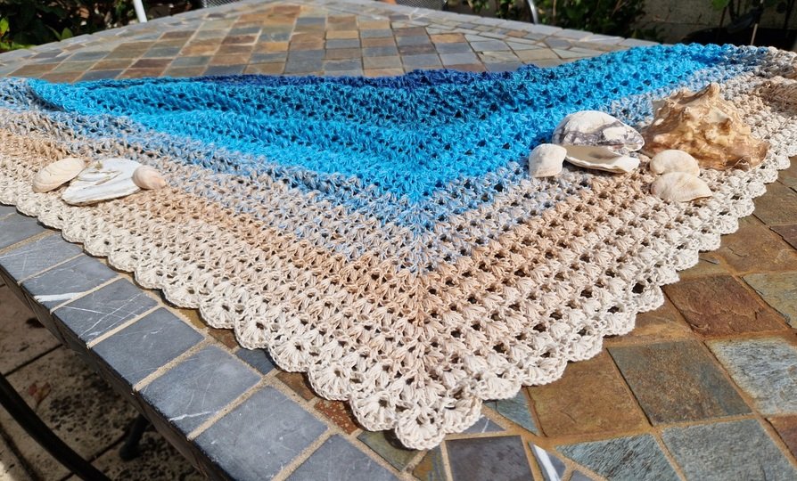 Mad Malibu ist ein symmetrisches Dreieckstuch mit einem effektvollen Endlosmuster und einer hübschen Abschlusskante
