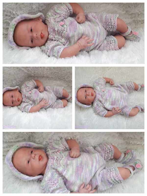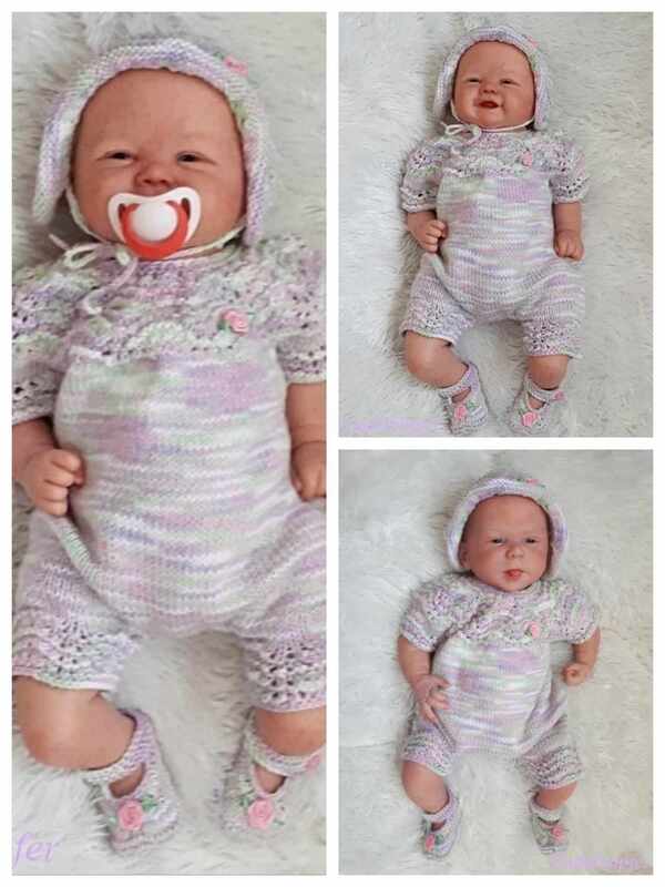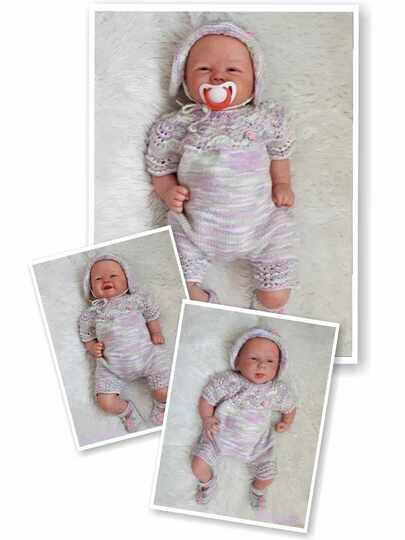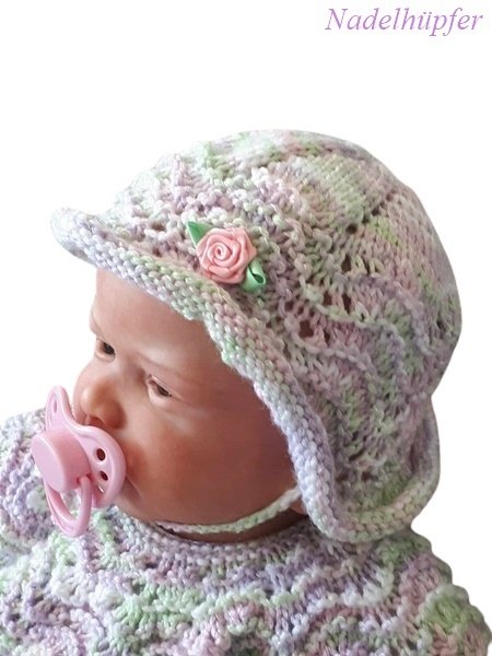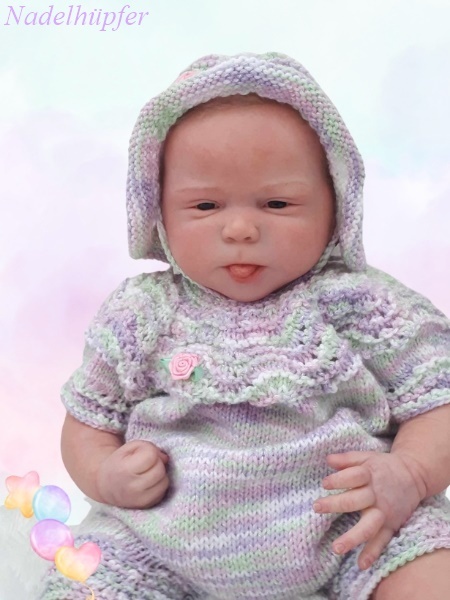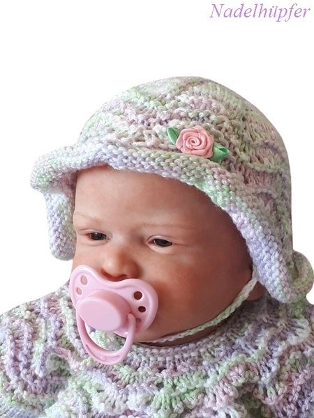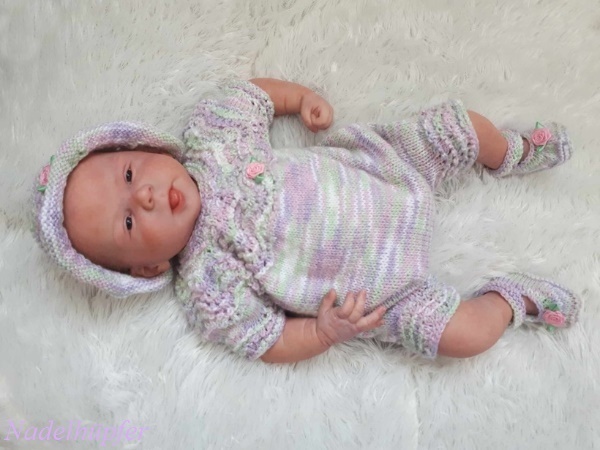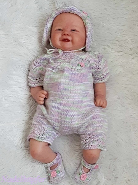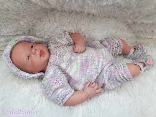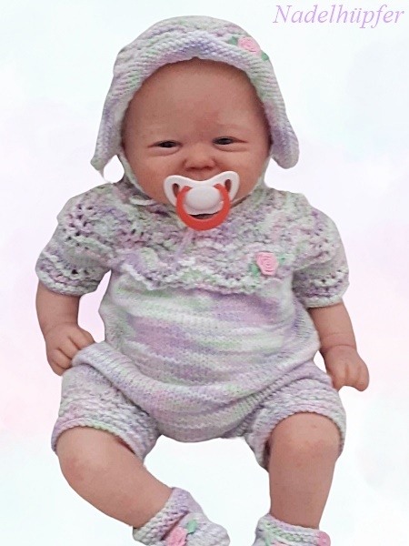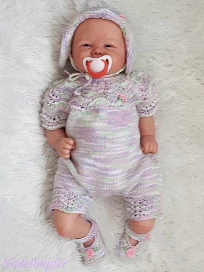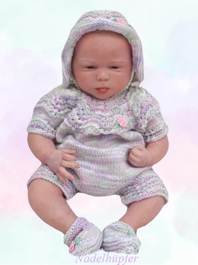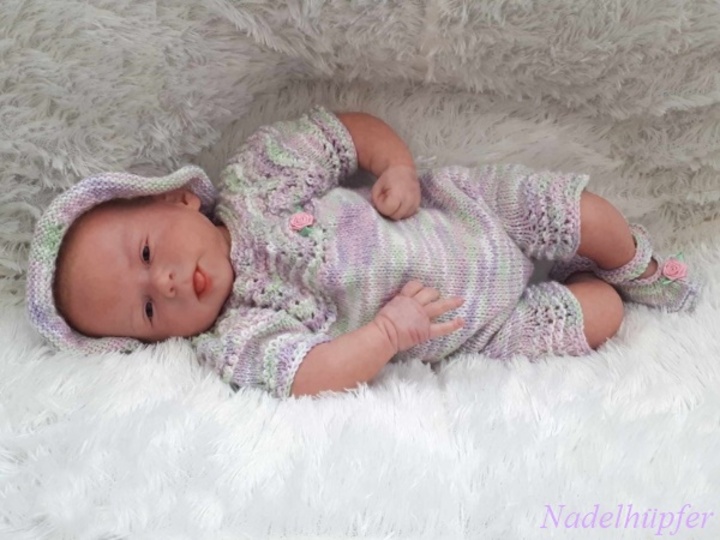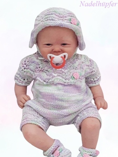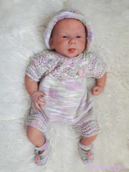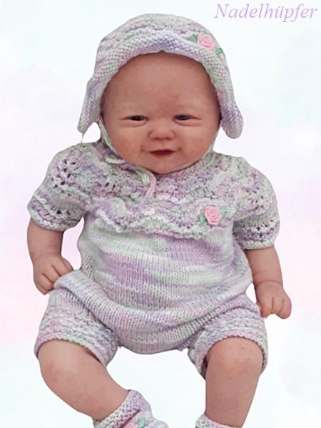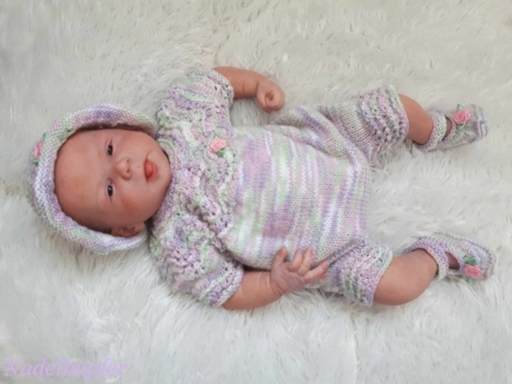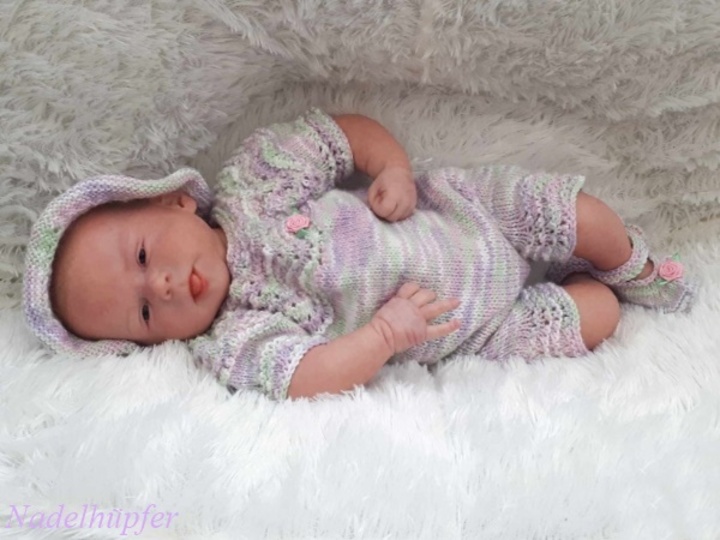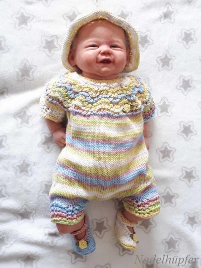 Der Strampler wird als Rundpasse (von oben) gestrickt. Dadurch wird er am Stück gestrickt und muss später nicht zusammengenäht werden. Der Hut und die Schuhe werden ebenfalls in Runden gestrickt. Für das ganze Set fällt nur eine kleine Naht bei den Schuhen an.