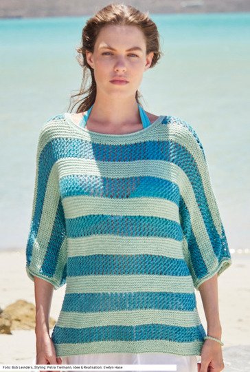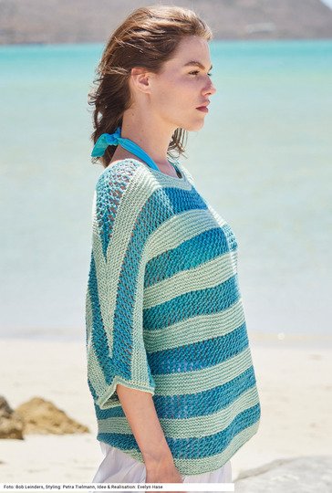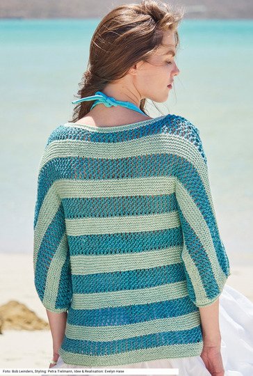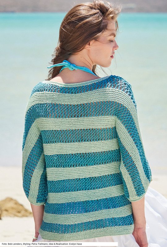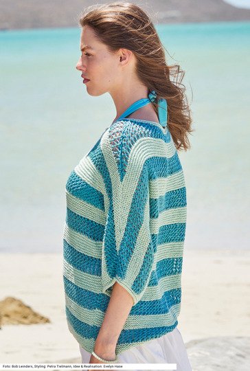 Moderate Fledermausärmel für viel Bewegungsfreiheit und ein breites Streifenmuster prädestinieren diesen Pullover dafür, ein Lieblingsstück zu werden. Das Streifenmuster, ein Mix aus hellgrünen, kraus rechts gestrickten Streifen und in Petrol gearbeiteten Ajourmuster-Streifen, versprüht Freizeit-Flair. Das Modell wird in zwei Teilen samt Ärmelhälften gestrickt. Saum-, Ärmel- und Ausschnittblende bekommen einen Rollrand aus glatt rechts. Das leichte Garn, bestehend aus einer Mischung von Viskose, Baumwolle, Leinen und Polyamid, liegt angenehm auf der Haut. Eine Anleitung gibt es für die Größen 38/40, 42/44 und 46/48.