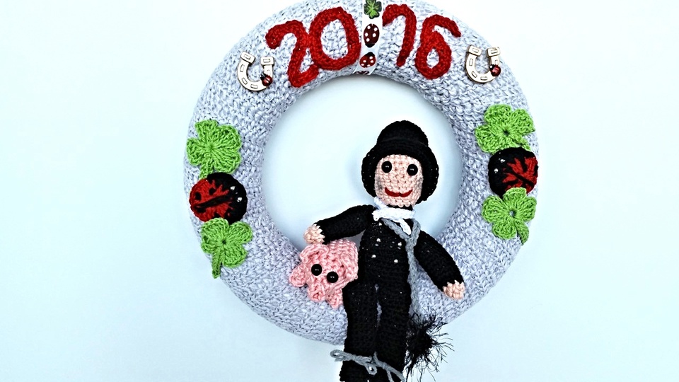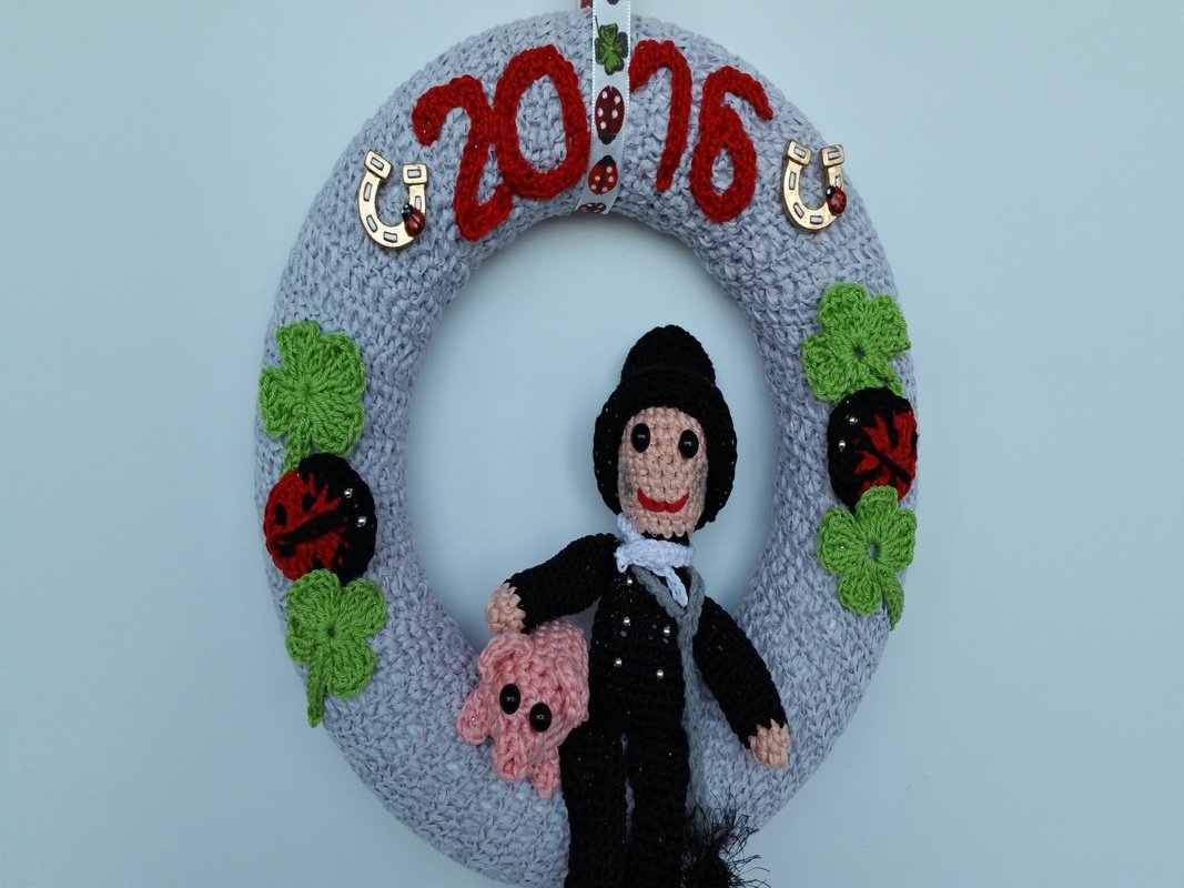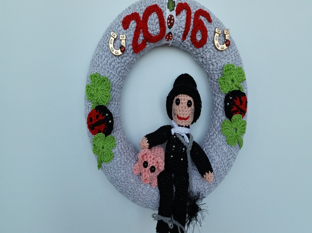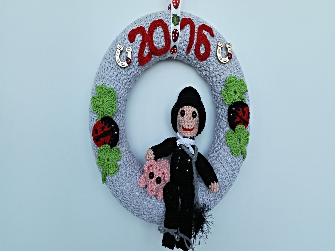 Ein Neujahreskranz für Ihre Wohnungstür mit den typischen Glücksbringern,wie Schornsteinfeger, Glücksschwein, Kleeblatt,Marienkäfer und Hufeisen.
