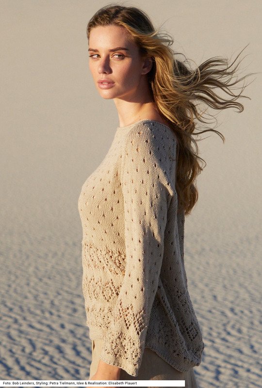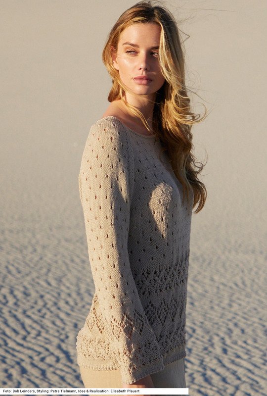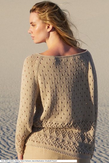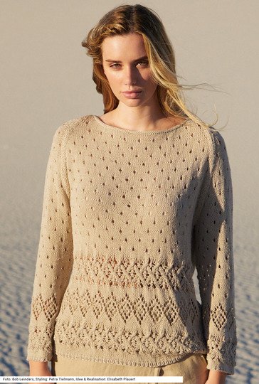 Beim Stricken dieses Raglanpullis werden versierte StrickerInnen ihre wahre Freude haben. Der Pulli mit weitem rundem Halsausschnitt besteht im oberen Bereich aus einem schlichten Lochmuster, hat an den Ärmel und am unteren Rand jedoch opulente Musterbordüren, die dem Modell eine besondere Note verleihen. Schmale Saum- und Ärmelblenden sind in 1/1-Rippen, die Ausschnittblende glatt links gestrickt. Der Pulli ist weit geschnitten, mit hohen Raglanschrägungen, sodass er im Sommer – noch dazu aus reinem Baumwollgarn – viel Luft an den Körper lasst. Die Anleitung dazu gibt es für die Größen 38/40, 42 und 44/46.
