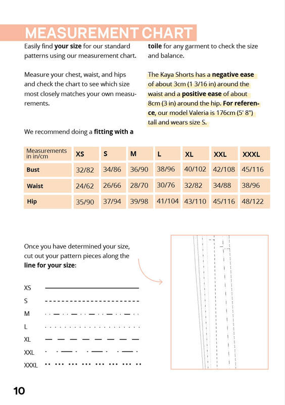 Das kurze Hose Schnittmuster The Kaya Shorts hat eine Mehrweite von ca. 8cm auf Höhe der Hüfte und ist an der Taille 3cm kleiner als der Hüftumfang geschnitten. Als Referenz: Unser Model Valeria ist 1,76m groß und trägt Größe S.