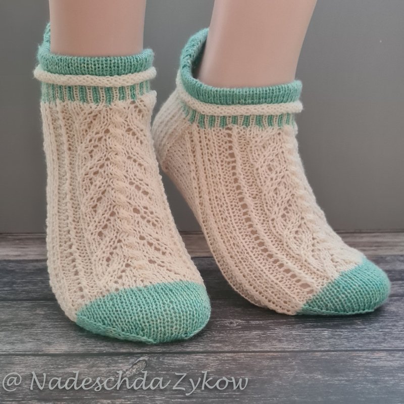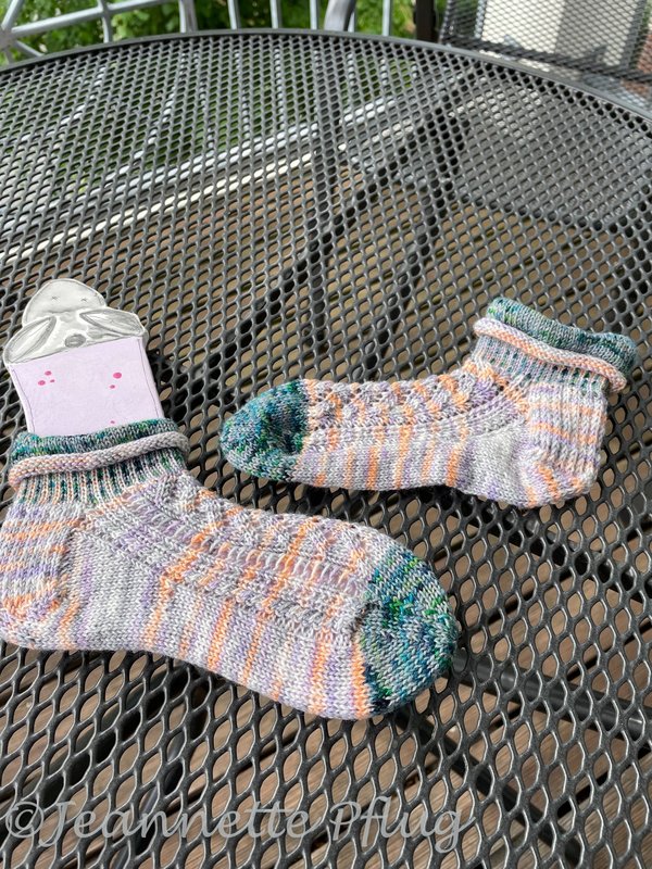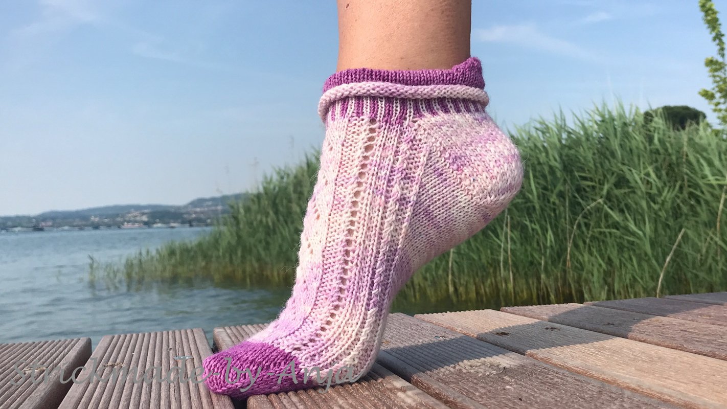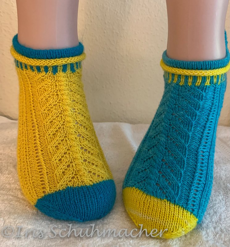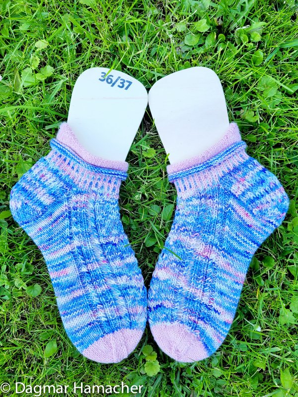 Die PDF Datei enthält die Anleitung für die oben gezeigten Sneakersocken in den Größen 36/37, 38/39 und 40/41.