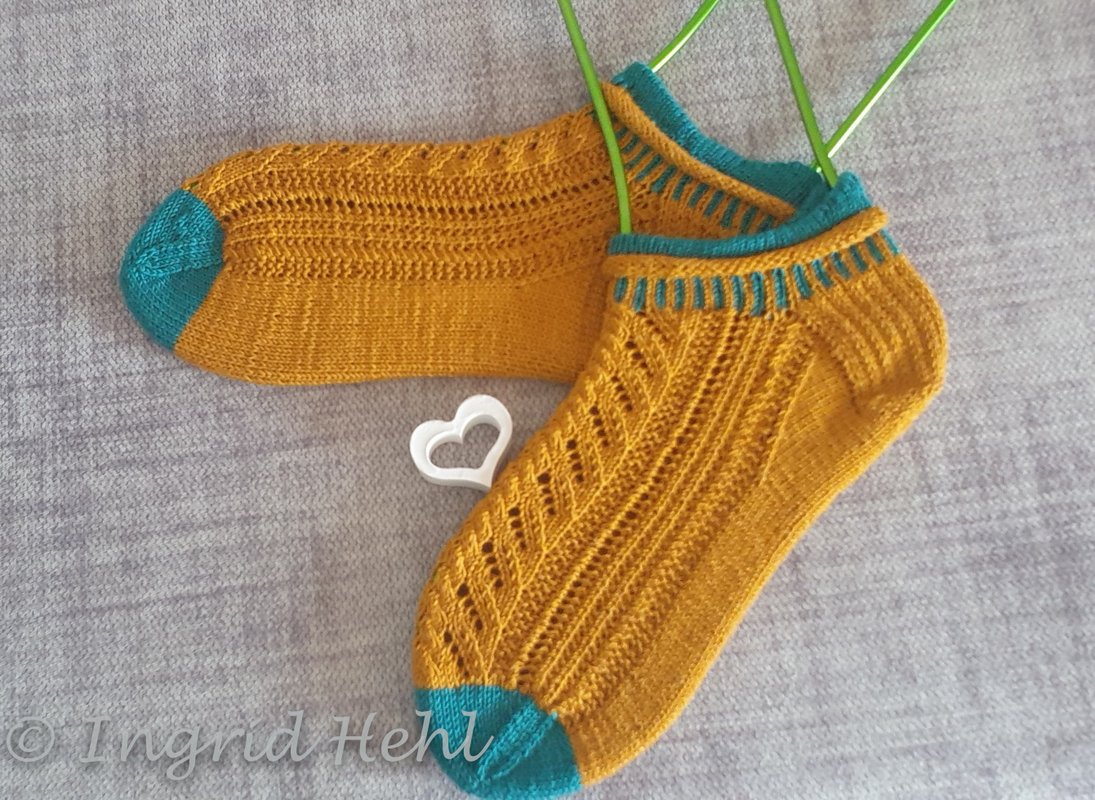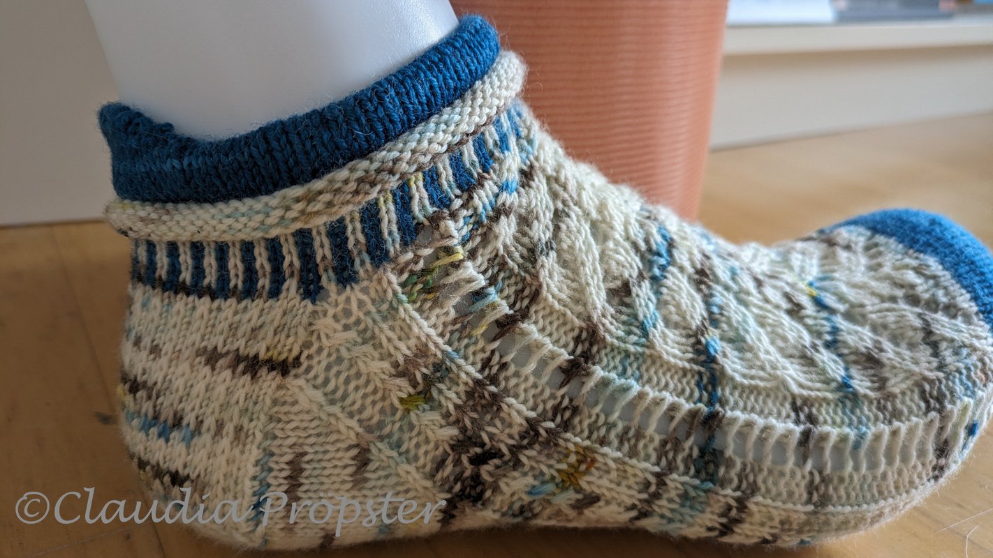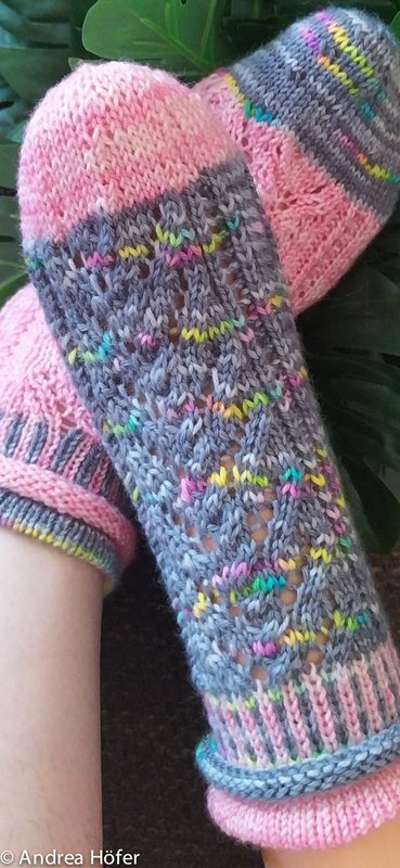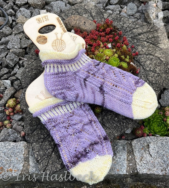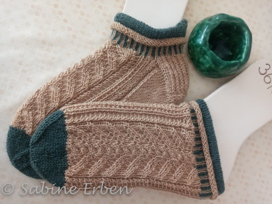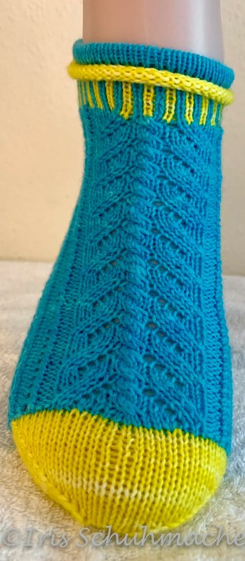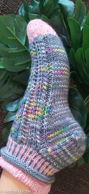 In der Anleitung ist das gezeigte Bündchen, die verstärkte Hufeisen-Ferse und die Bandspitze beschrieben. Es kann aber beliebig ausgetauscht werden.
