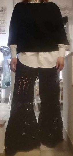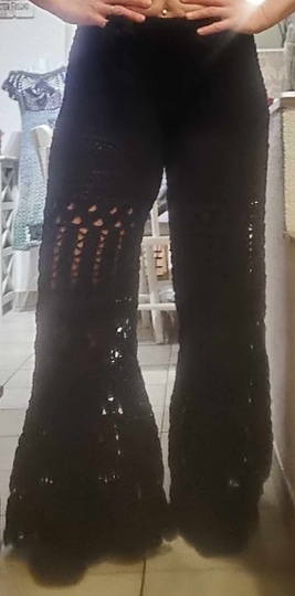 Die schwarze Hose wurde mit 350 m 3 fädigen Bobbel (undurchsichtiges Oberteil/Bund) und 1300 m 4fädigem Bobbel (transparenter Teil) mit Häkelnadeln Nr. 3 und 3,5 gehäkelt