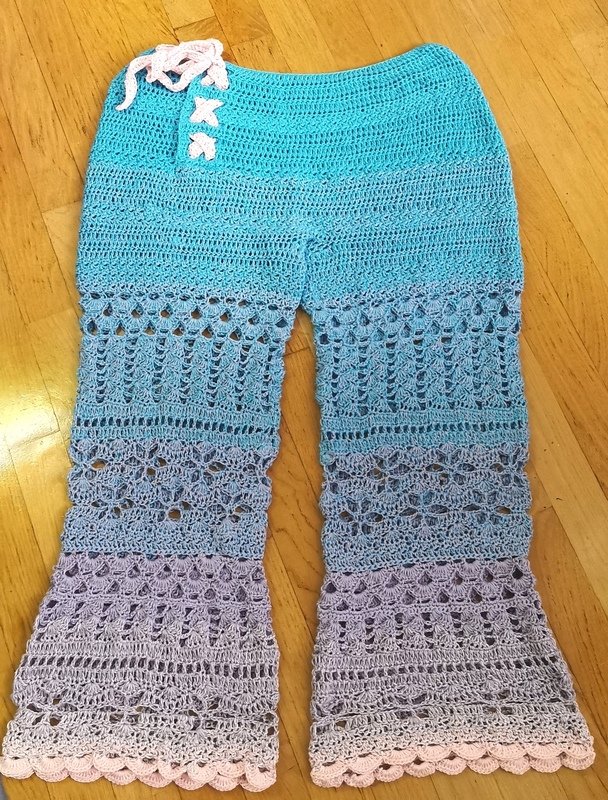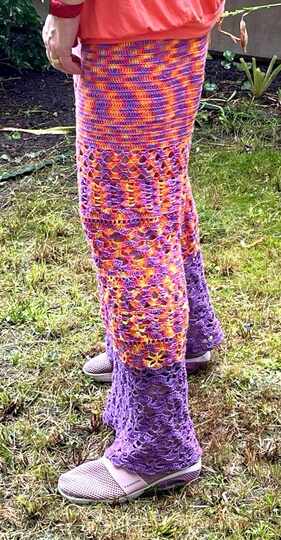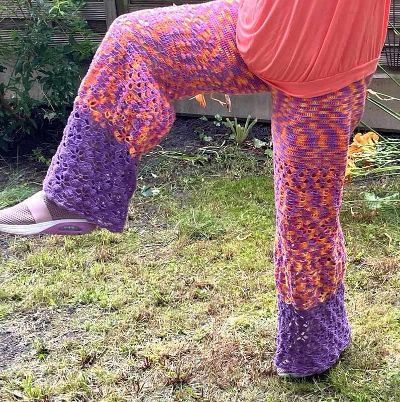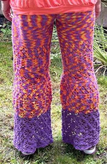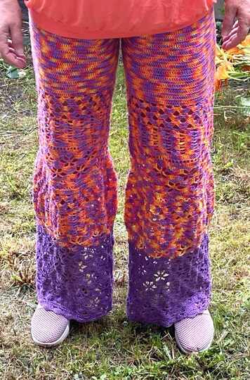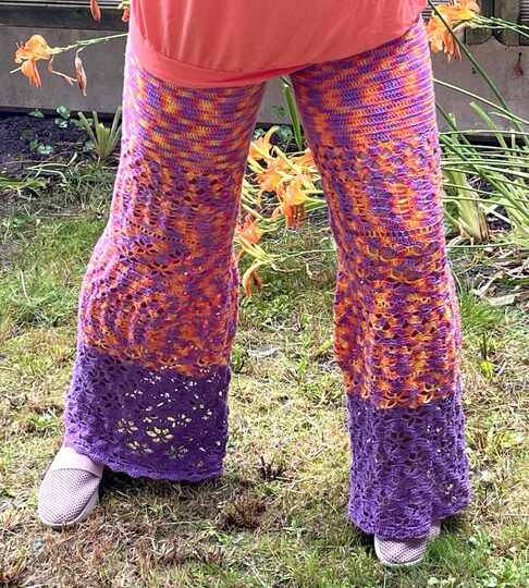 Die orange/violette Hose wurde mit 611 g (ca. 2.029 m) Alison & Mae Essentials mixed fine und 112 g (ca. 380 m) Cotton kings cone gearbeitet, gehäkelt wurde mit den Häkelnadeln Nr. 3,75 und 4.