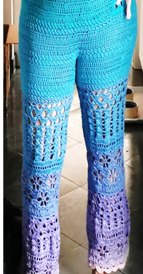 Es werden im nicht transparenten Teil der Hose stabilisierende Musterreihen eingehäkelt, wenn ihr ganz sicher gehen möchtet, dass sich nichts dehnt und die Hose perfekt anliegt, dann häkelt bitte im oberen Teil transparentes Strick-Elastic mit ein.