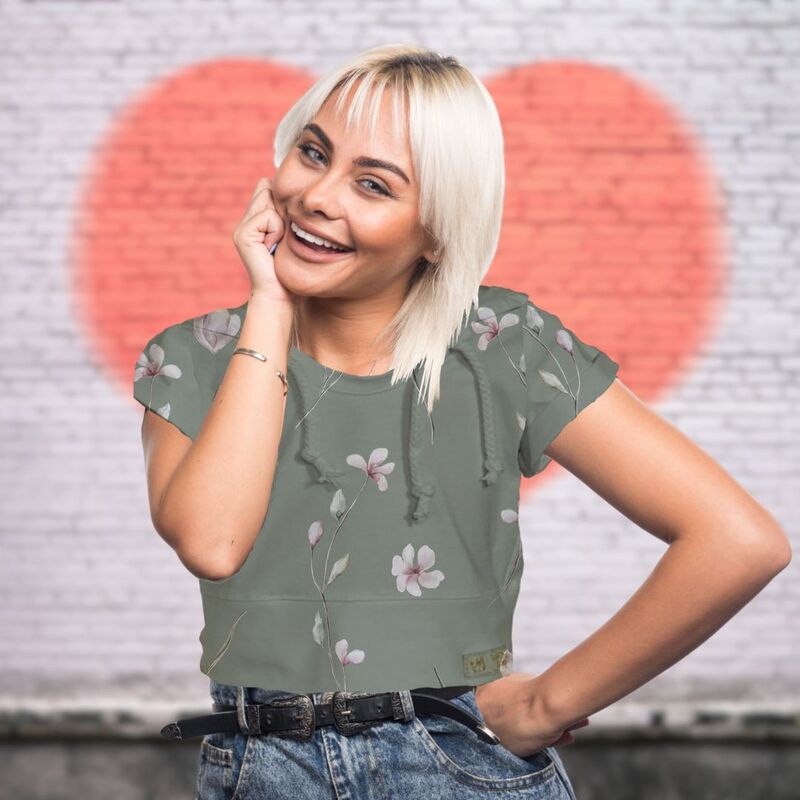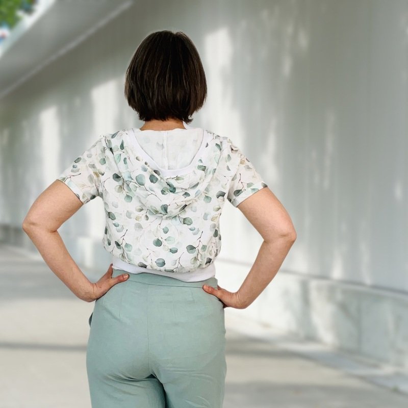 Mit dem Schnittmuster Ivy kannst du ein stylisches Damen-T-Shirt mit Kapuze kreieren. Dieses Crop-Shirt lässt sich wunderbar mit einem Tanktop oder einem leichten Hemd kombinieren.