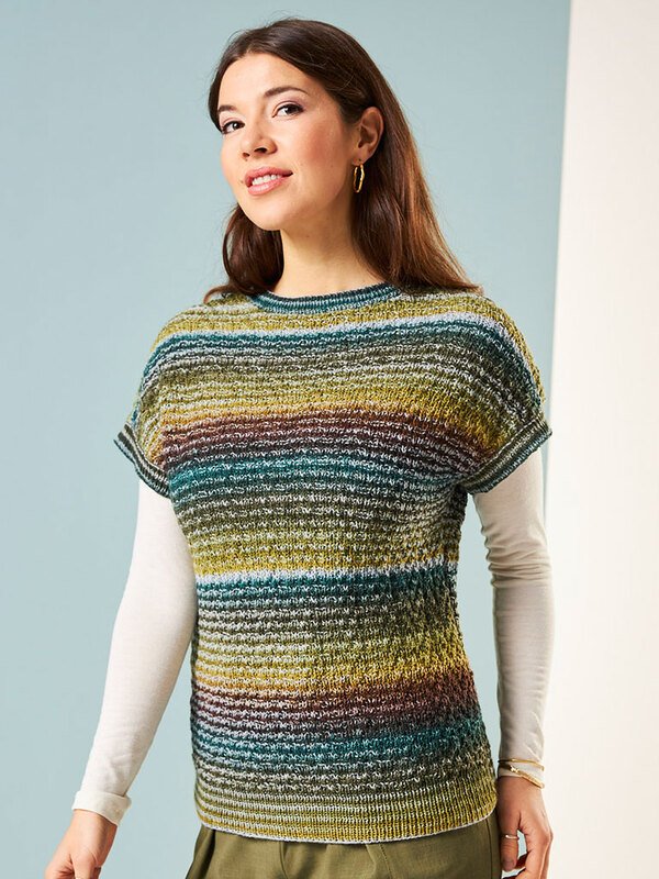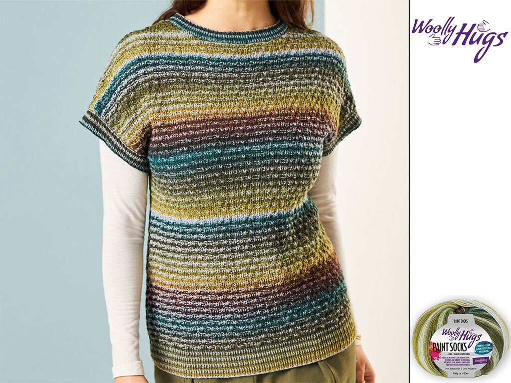 Mit der Anleitung für den Kurzarm-Pullover "Dschungel" aus der faszinierenden Wolle "Woolly Hugs Paint Socks" zauberst du dir ein einzigartiges Kleidungsstück, das alle Blicke auf sich ziehen wird.