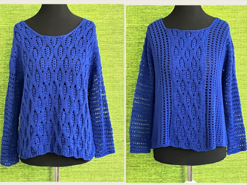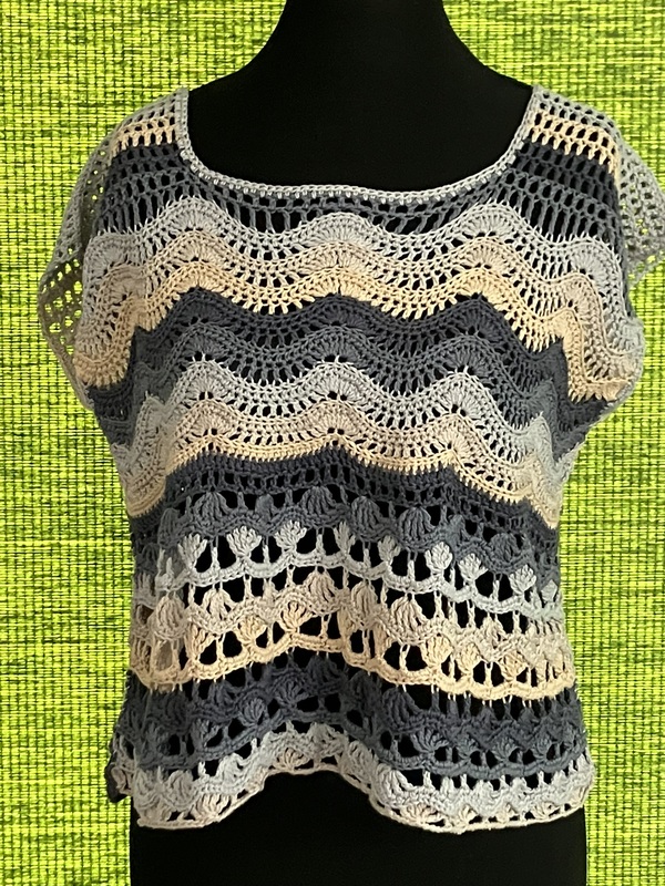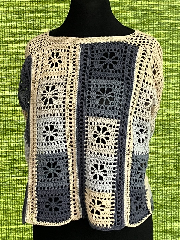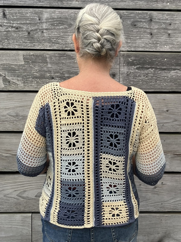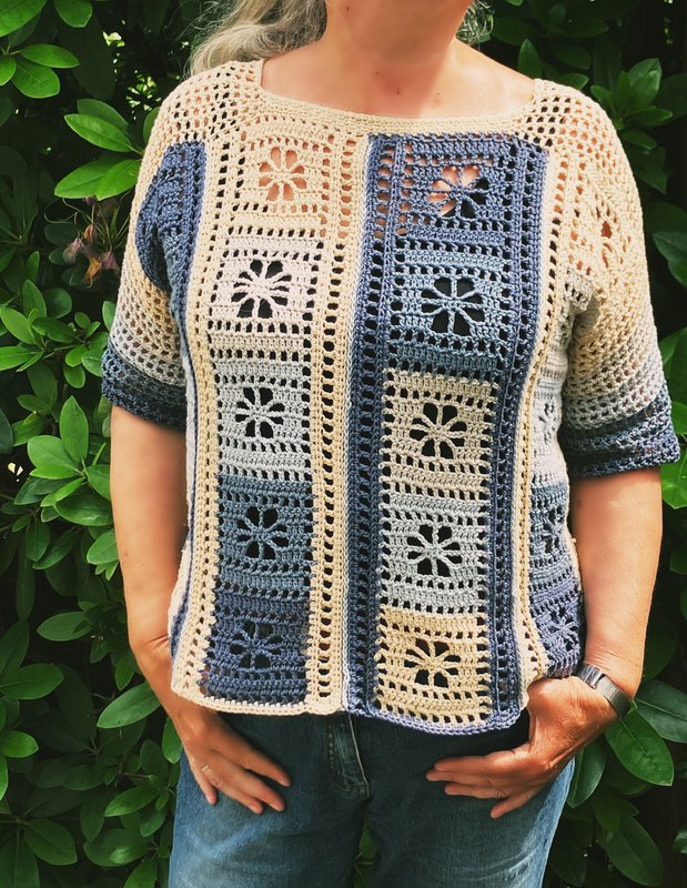 Es hat 2 Teile (Vorder- und Rückenteil), die Ärmel (wenn gewünscht) werden ohne Naht angehäkelt. Das Shirt sieht auch einfarbig super aus.