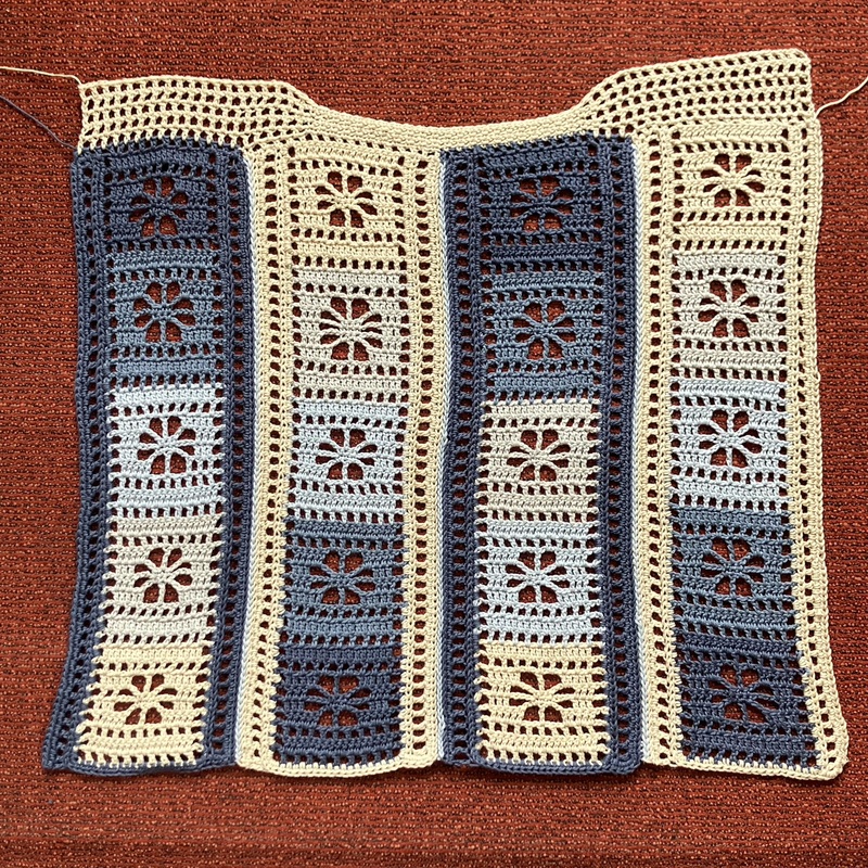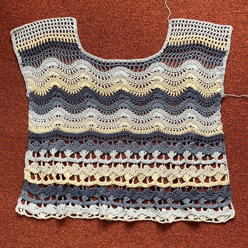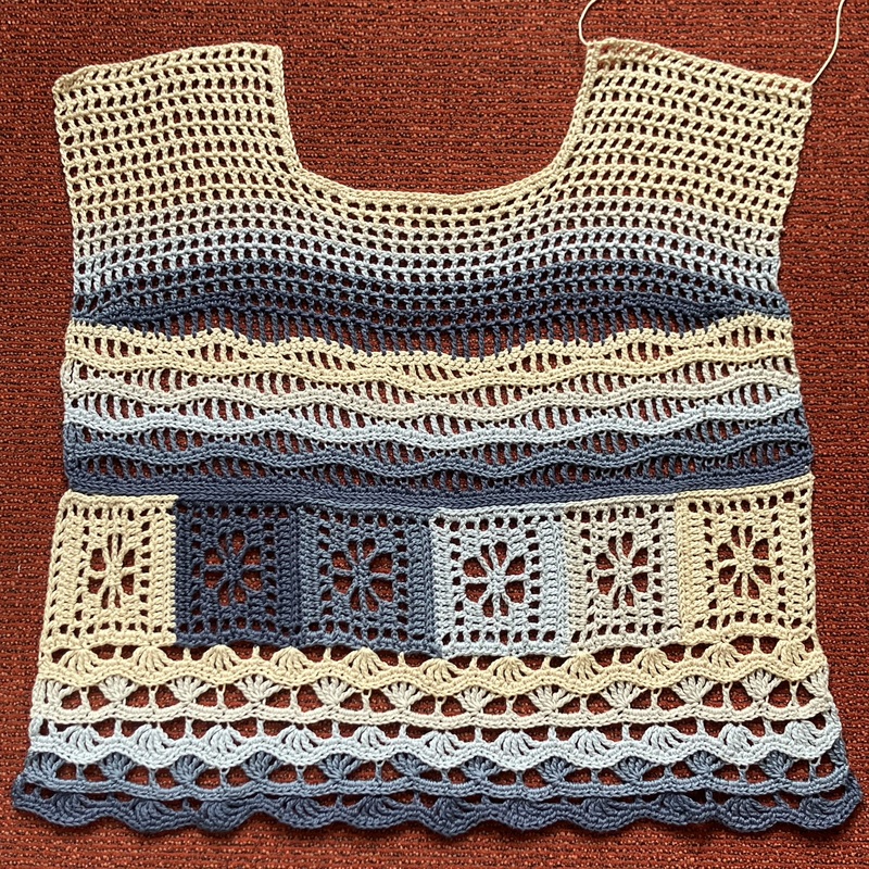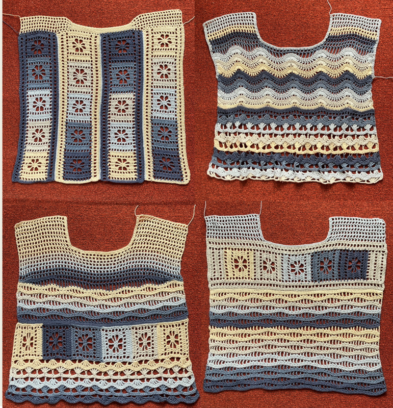 Bei uns im Ort hat leider der Wolleladen für immer aufgegeben. Die Inhaberin gab auf alles 40% Rabatt, „alles muss raus“. So bin ich an diese Wolle (Catania) in 5 Farben gekommen, von der ich mehr gekauft habe, als ich brauchte. Diese 4 Teile mit unterschiedlichen Designs sind nun das Ergebnis. Du kannst sie beliebig (Vorderteil + Rückenteil) kombinieren. Der Schnitt ist wieder so gehalten, dass ein möglicherweise vorhandenes Bäuchlein gut kaschiert wird. Ich habe es ziemlich kurz gehalten (fast ein Crop Top) aber es ist problemlos zu verlängern, indem man von oben kommend einfach unten weitere Reihen häkelt.