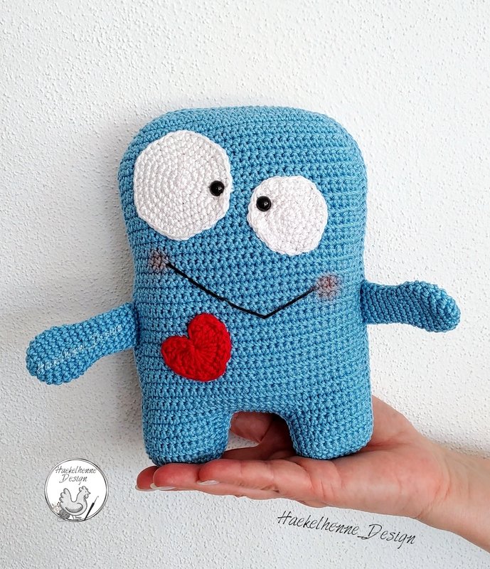 Mit der NS 2,5 mm erreicht das Monster eine Länge von ca. 20 cm und die Breite verläuft sich ohne ausgestreckte Arme auf 14 cm. Das von mir in den Beispielbildern abgebildetet Rosa Monster habe ich mit einer NS von 2,0 mm gehäkelt, dadurch wirkt dieses neben dem Blauen Monster etwas kleiner. Die Größe variiert mit der von dir verwendeten NS und der ausgewählten Wolle.