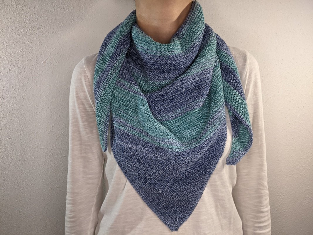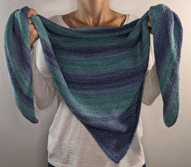 Von der Spitze beginnend wird in jeder Reihe eine Masche zugenommen und es werden ausschließlich rechte Maschen gestrickt. Mit den sommerlichen Farbtönen von Blau bis Türkis ist es vor allem im Frühjahr, aber auch im Herbst ein auffälliger Hingucker.