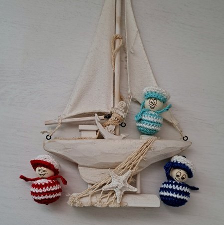 Die Kleinen Matrosen bestehen aus drei Teilen und einer Holzkugel und sind schnell gehäkelt.