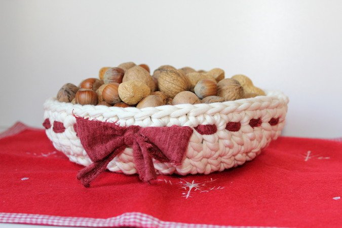 Nicht nur zur Weihnachtszeit findet diese Schale ihren Platz auf jedem gedeckten Tisch. Egal, ob mit Obst, Nüssen oder Frühstücksbrötchen - mit ihren 22 cm Durchmesser kann die Schale auch mit anderen Dingen gefüllt werden. Sie benötigen ca. 200 g Textilgarn in cremefarben und ca. 1 m Textilgarn in einer anderen Farbe zum Durchziehen. Alternativ kann hier auch jedes Geschenkband verwendet werden. Die Größe kann mit der Schritt-für-Schritt-Anleitung ganz einfach variabel gehäkelt werden. Gehäkelt wurde mit einer Häkelnadel in Nadelstärke 10.