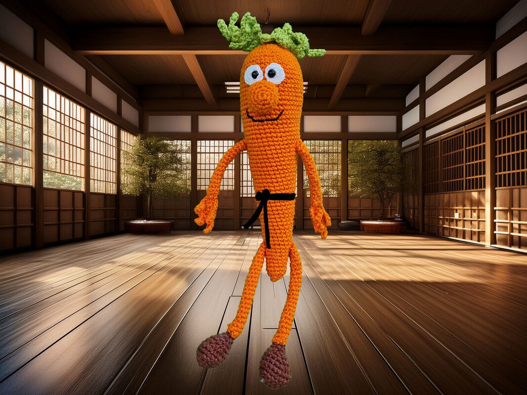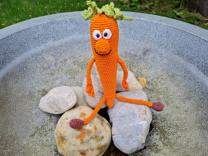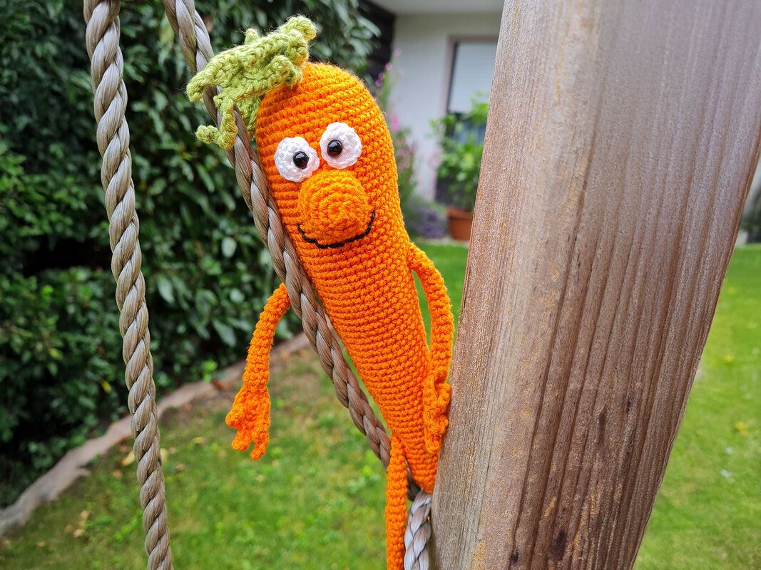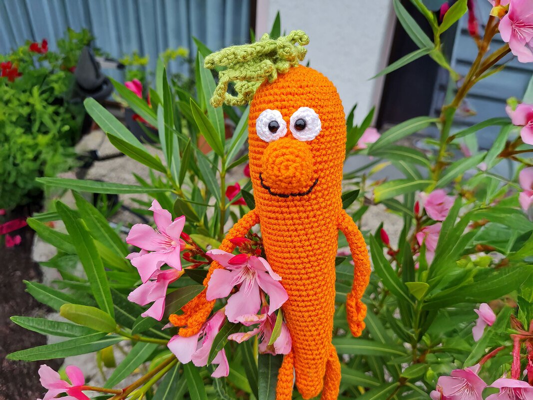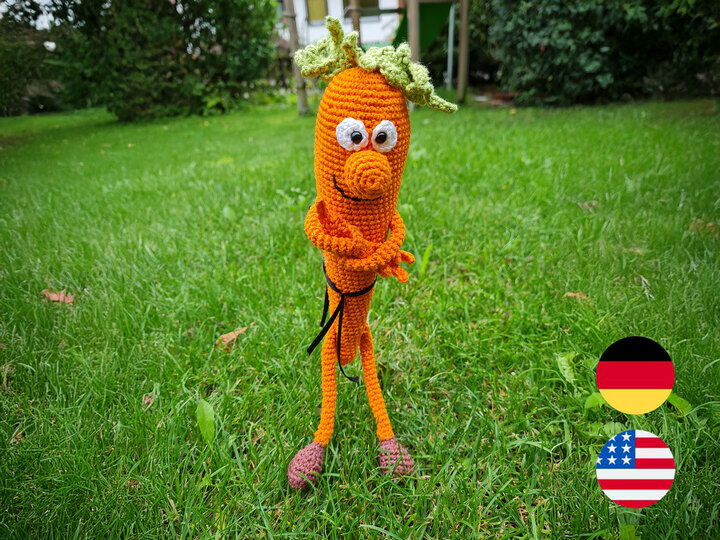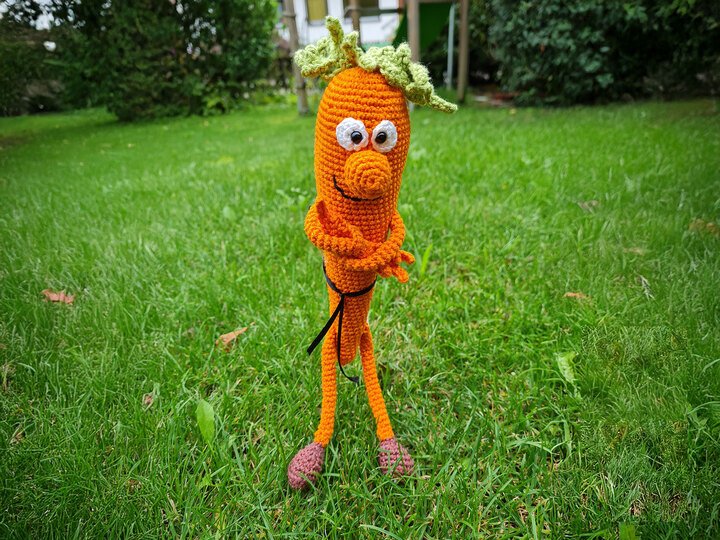 Der coole Freund aus der Gemüsekiste, der sich dazu entschlossen hat, für Kinder der beste Freund zu sein. Er wird mit viel Liebe und Sorgfalt von deiner talentierten Hand nach dieser Anleitung gehäkelt und strahlt dann in leuchtendem Orange. Die wilde grüne Frisur komplettiert sein charmantes Aussehen, als ob er gerade aus einem Märchengarten entsprungen wäre. Er ist jedem ein guter Beschützer, denn er hat den schwarzen Gürtel in Karotte!