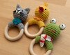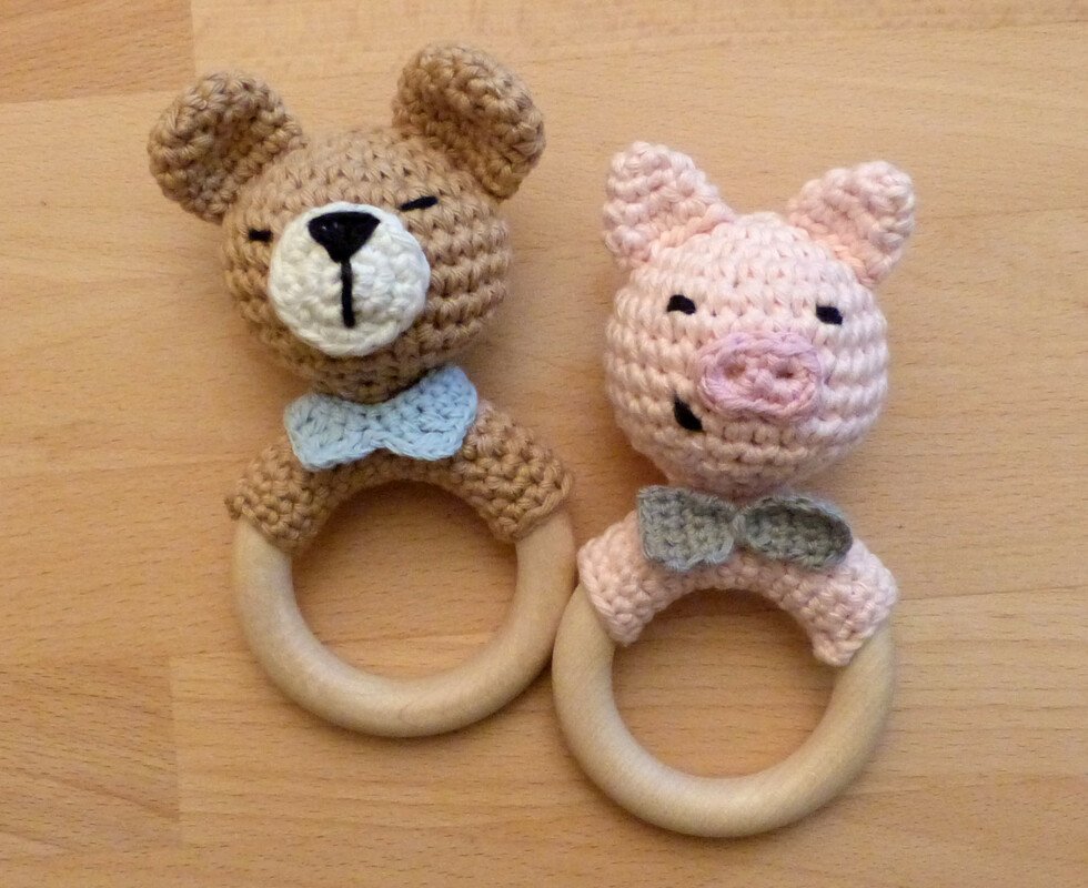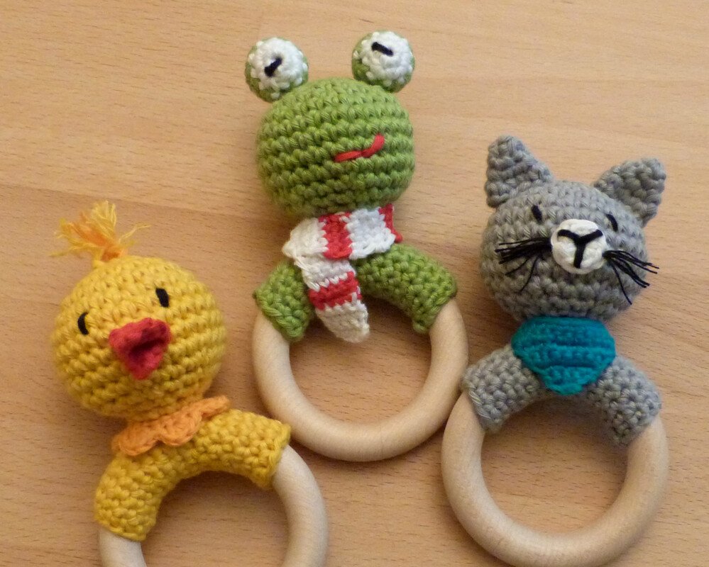 Ein Rassel-Greifling ist ein tolles erstes Spielzeug für Babys ab ca. 3 Monaten und bietet viele Möglichkeiten, motorische und sensorische Fähigkeiten zu trainieren: Man kann ihn fühlen, greifen, sehen und hören. Der Holzring kann in den Mund gesteckt werden und auch hilfreich beim Zahnen sein. Das gehäkelte Spielzeug ist leicht und es geht nicht kaputt, wenn es mal runterfällt! Es werden die 5 Modelle Katze, Frosch, Schwein, Küken und Bär beschrieben.