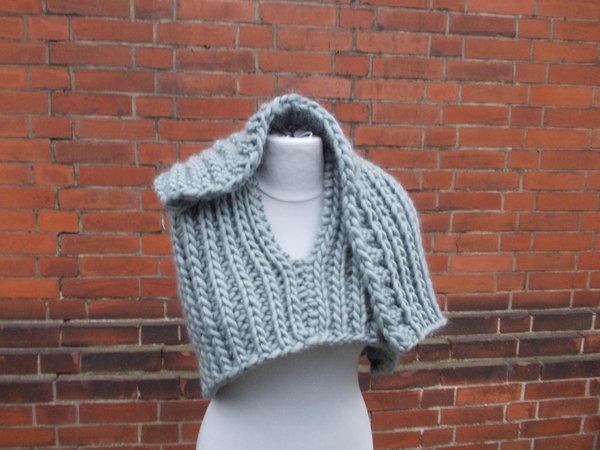 Da ich ausgefallene Schnitte mag und vor allem viele Tragevarianten bevorzuge, habe ich diesen armlosen Sweater "ausgeknobelt", welcher als Weste, Überwurf, Jacke und Rundschal getragen werden kann. Einige schöne Varianten habe ich in Bildern dargestellt. Es gibt jedoch noch zahlreiche Varianten mehr.