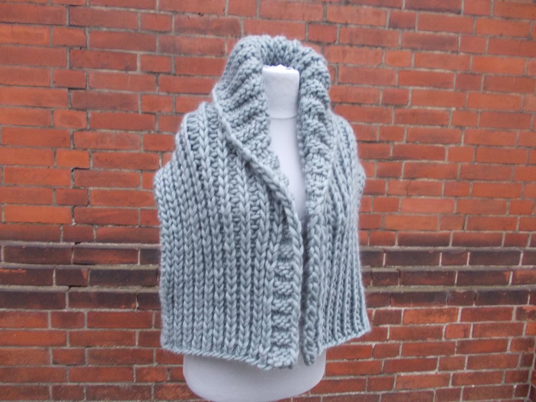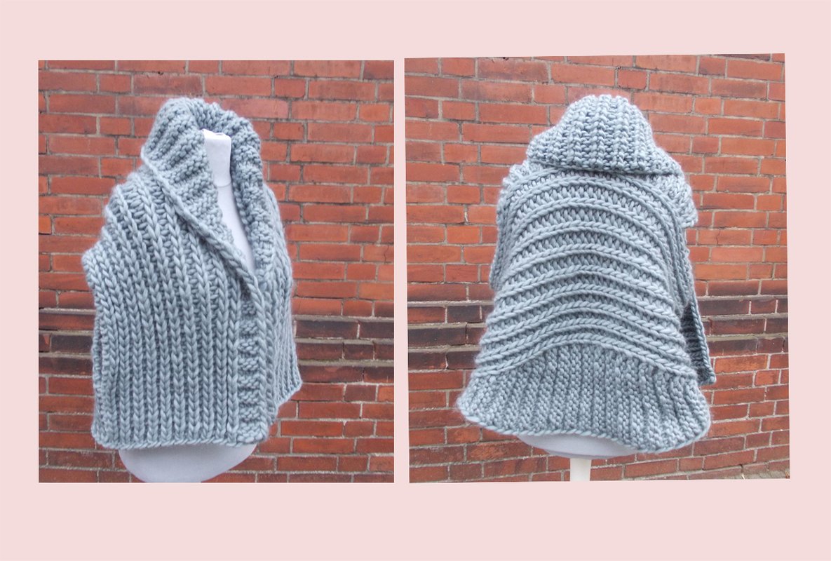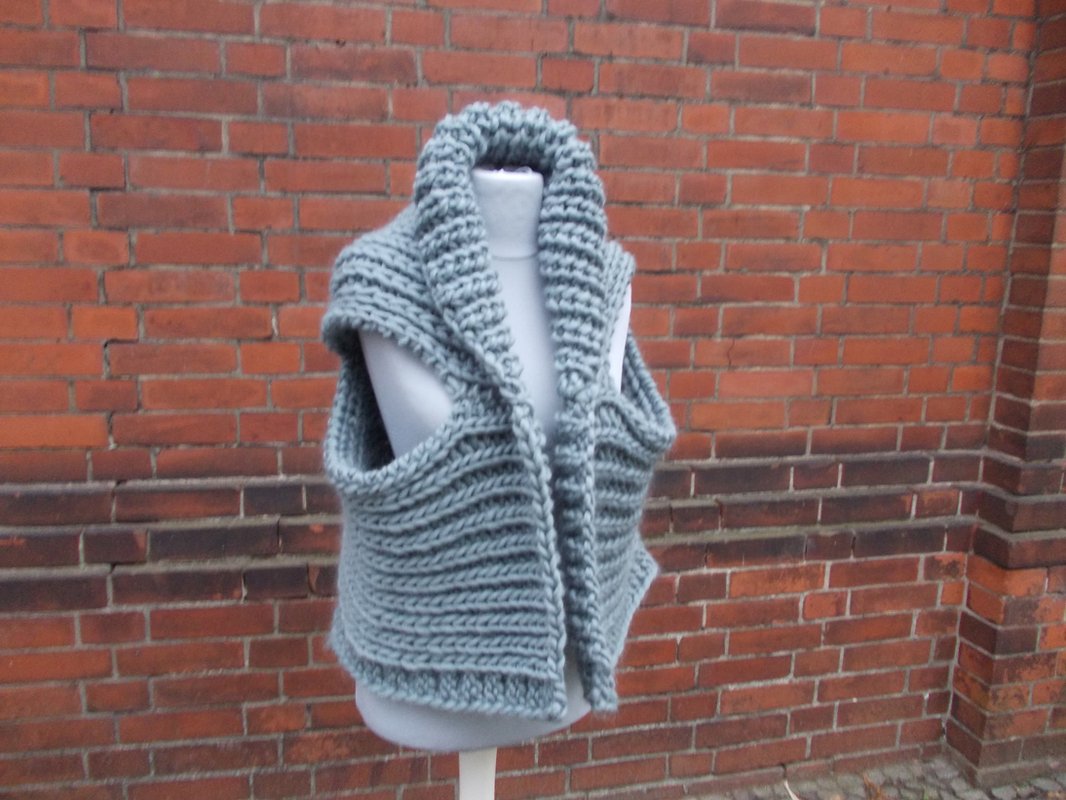Da ich ausgefallene Schnitte mag und vor allem viele Tragevarianten bevorzuge, habe ich diesen armlosen Sweater "ausgeknobelt", welcher als Weste, Überwurf, Jacke und Rundschal getragen werden kann. Einige schöne Varianten habe ich in Bildern dargestellt. Es gibt jedoch noch zahlreiche Varianten mehr.