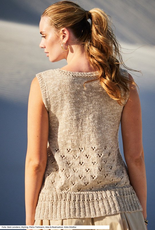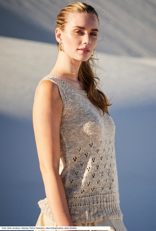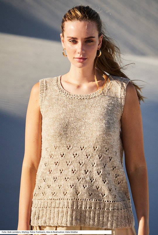 Dieses sandfarbene Top ist ein perfekter Allrounder, der durch den leichten A-Linien-Schnitt eine tolle Silhouette zaubert. Das melierte Garn hat einen hohen Leinenanteil und bekommt dadurch einen etwas robusteren Charakter; weitere Beimischung ist Baumwolle und Viskose. Nach dem hohen Bund aus 2/2-Rippen kommen zwei schmale Streifen im Lochmuster und dazwischen ebenfalls diese Rippen, dann folgt ein kleines Ajourmuster, das in glatt rechts übergeht. Das Lochmuster findet sich auch zu Beginn der 1/1-Rippenblende am runden Halsausschnitt. Eine Anleitung steht in den Größen 36/38, 42/44 und 46/48 zur Verfügung.