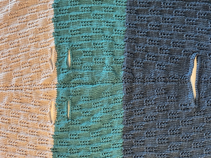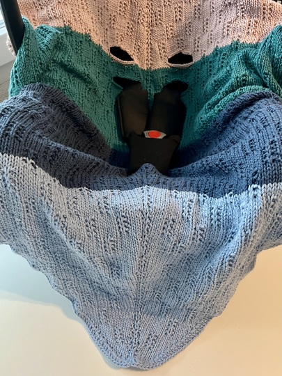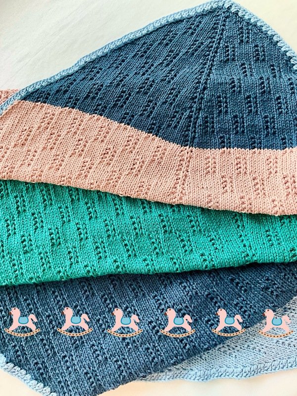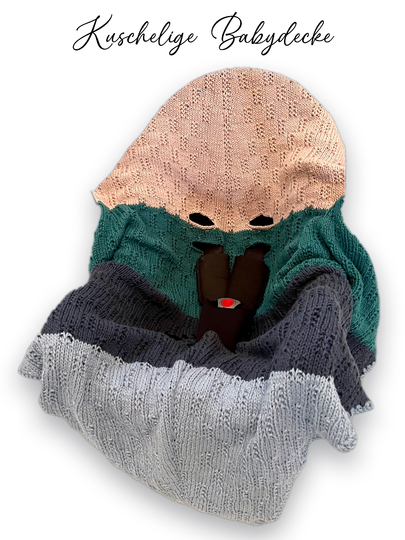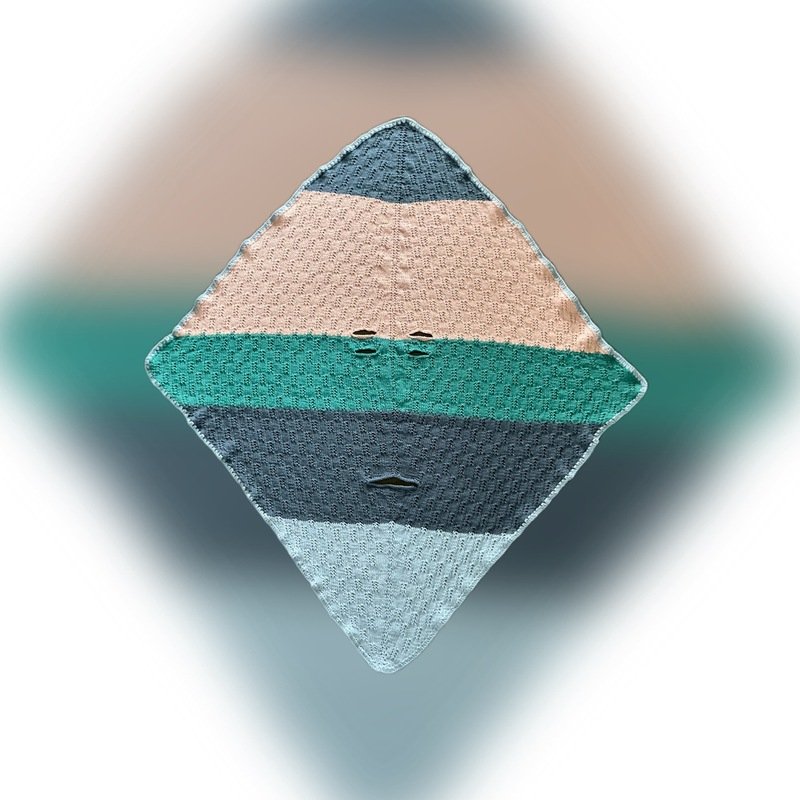 Gestrickt wird diagonal von einer Ecke aus. Den Farbwechsel kann man nach Gutdünken vornehmen oder die Decke einfach in uni stricken. Das schöne Muster kommt einfarbeig schön zur Geltung und vereinfacht somit die Fertigstellung.