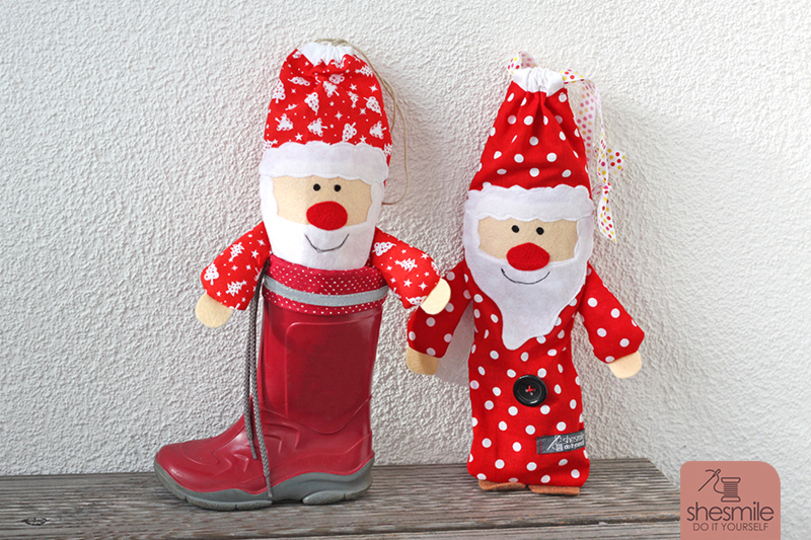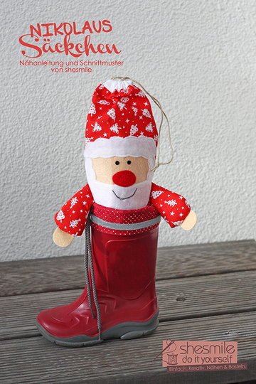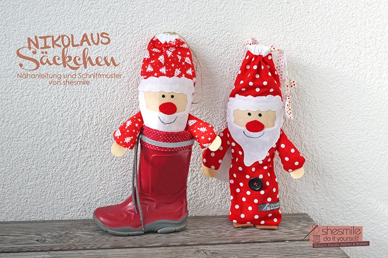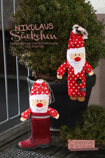 Nähanleitung und Schnittmuster gestaltet als PDF-E-Book für supersüße Nikolaus-Säckchen zum Aufhängen vor der Tür oder Verstecken im Kinderstiefel.
