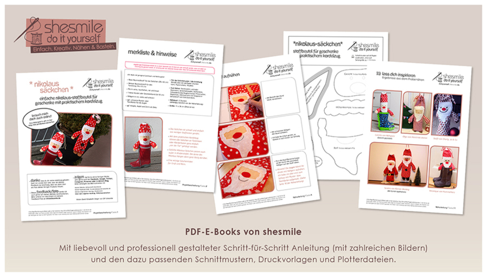 PDF-E-Books von shesmile: Diese leicht verständliche Schritt-für-Schritt-Anleitung mit vielen Fotos ist auch für Nähanfänger geeignet, denn die sehr ausführliche Fotoanleitungen begleitet dich bei jedem Schritt.