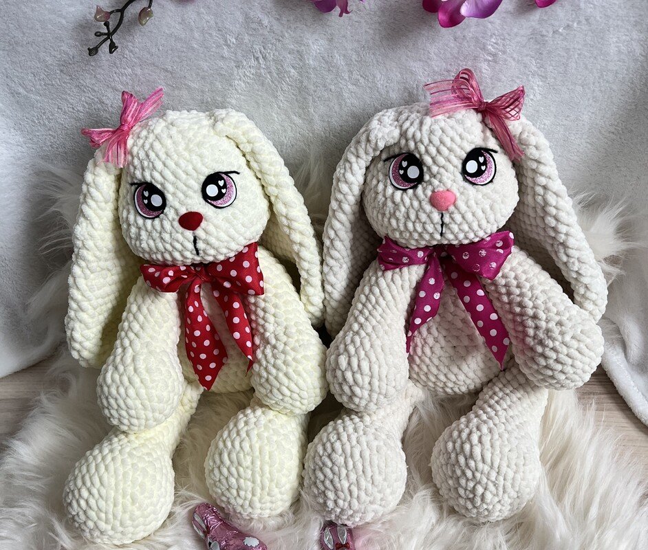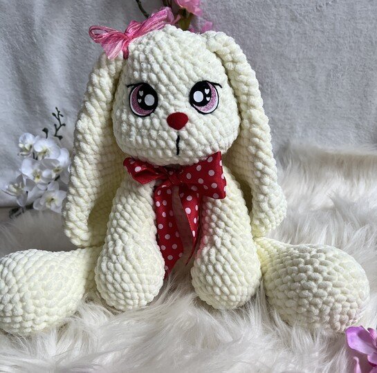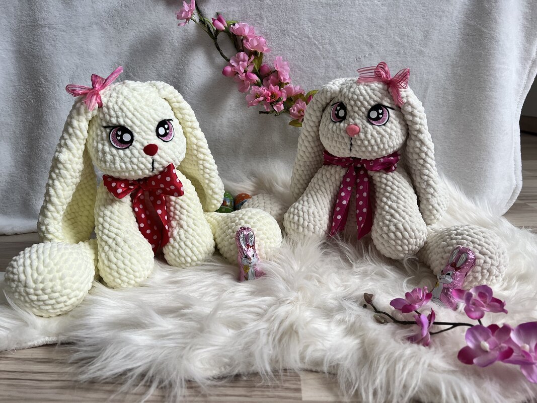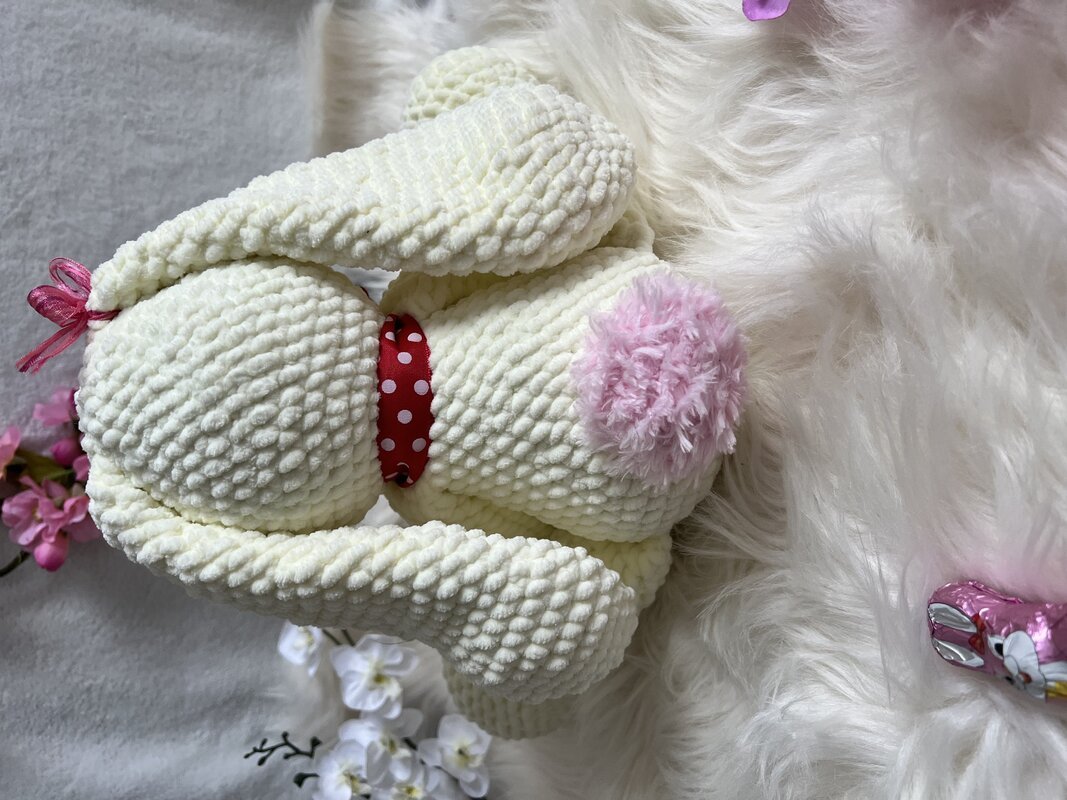 Die langen Ohren kann man mit einem Schleifenband zu einem Zopf zusammenbinden.