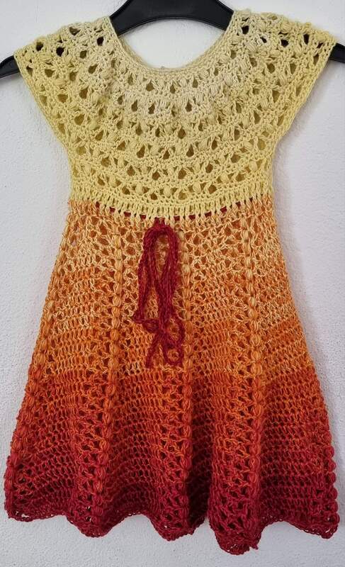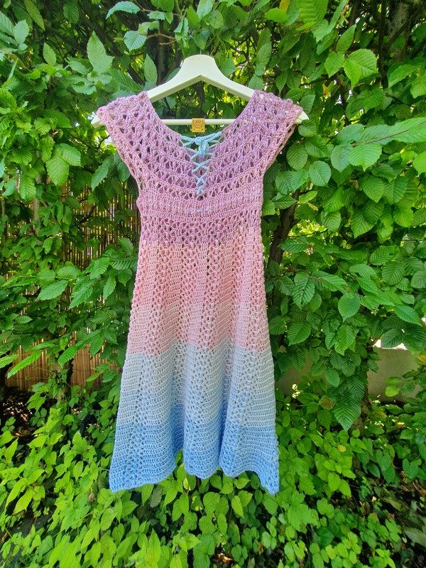 Gehäkelt wird dieses Kleidchen mit 4fädigem Farbverlaufsgarn, bzw. mit einem Garn in der adäquaten Stärke. Es sollte sich bei Babykleidung um Schadstoffarme Materialien handeln und ich empfehle 50/50 BW/PA , da man dieses Material pflegeleicht in der Waschmaschine reinigen kann.