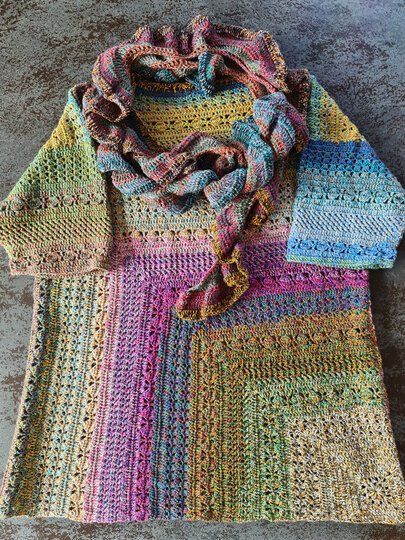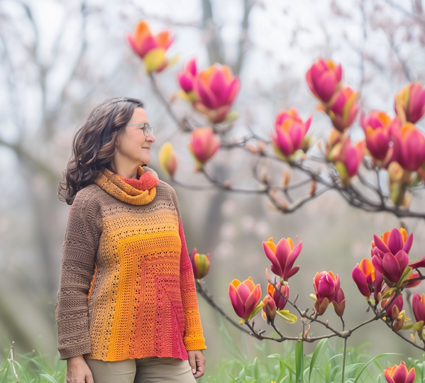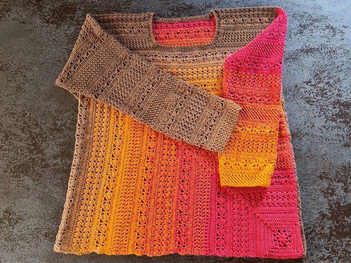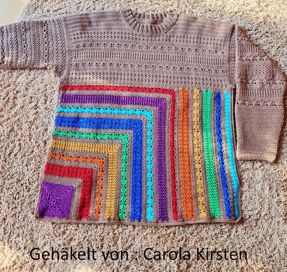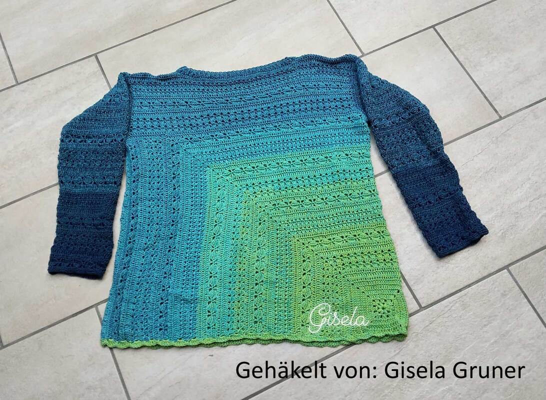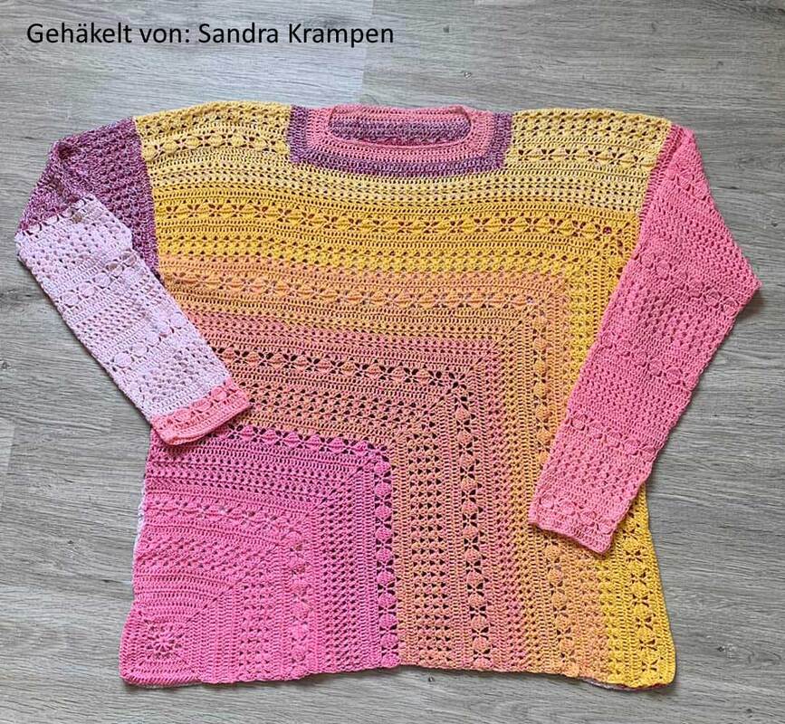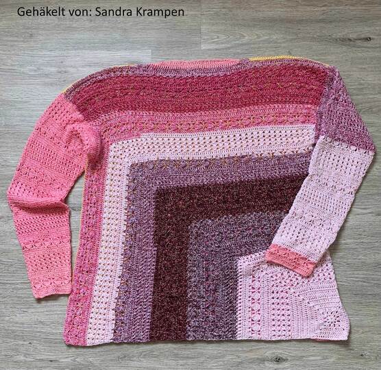Du beginnst ganz unscheinbar – mit einem kleinen, dekorativen Granny-Eckelement. Doch Masche für Masche wächst daraus dein neuer Lieblingspulli: locker, bequem und mit einem Farbverlauf, der sich über Vorder- und Rückenteil wie von selbst entfaltet.