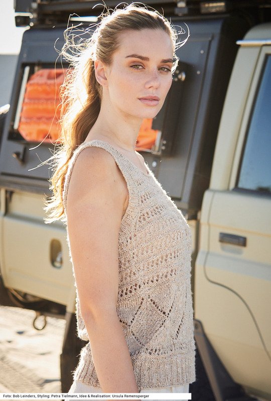 Zwei, die gut zueinander passen: Das Top mit großen Ajourrauten und Lochrippen sowie die geräumige Tasche aus Reliefstäbchen setzen ganz auf Natur: sowohl in der Farbgebung – das Top leinenfarben, die Tasche cremefarben – als auch in der Zusammensetzung der Garne mit Leinen-, Baumwolle- und Viskoseanteil. Der Pulli hat Rippen am Saum und an den Armausschnitten sowie einen I-Cord-Rand um den tiefen, runden Halsausschnitt. Die Tasche bekommt noch ein paar Bommel und ein Label angenäht. Dazu gibt es die Anleitung in den Größen 36/38, 40/42 und 44/46, die Tasche misst 44 x 30 cm.