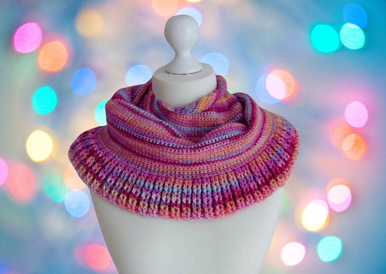 Ich empfehle dir einen Bobbel / Farbverlaufsgarn mit mindestens 1.000m und 4 Fäden und eine Nadelstärke 4!