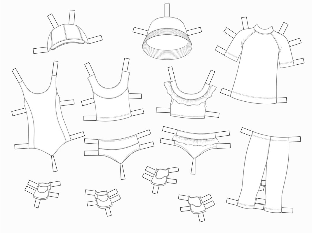 Zum Spielen am Strand und zum Baden im Meer braucht auch ein Papierpuppenjunge passende Kleidung. Mit dieser Kollektion kannst du deine Puppe mit Badehosen, Aquaschuhen, UV-Kleidung und Kopfbedeckung ausstatten.