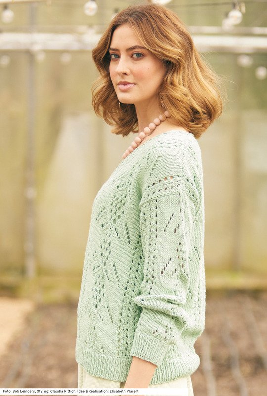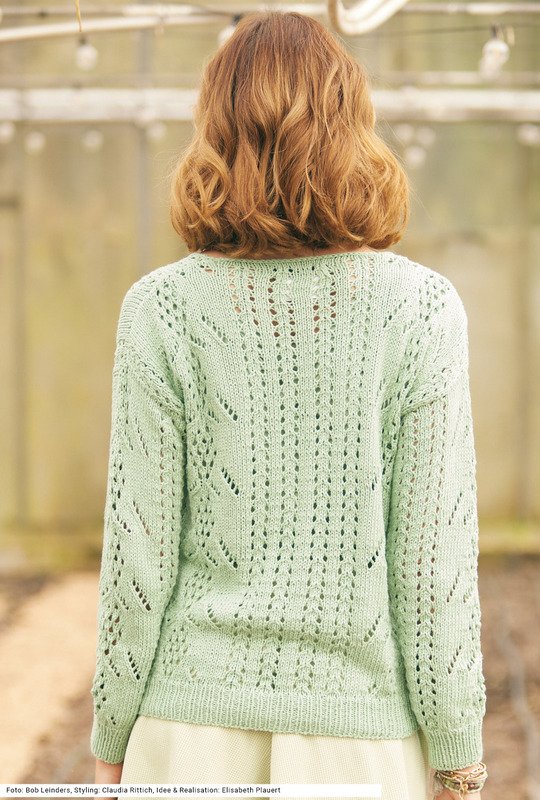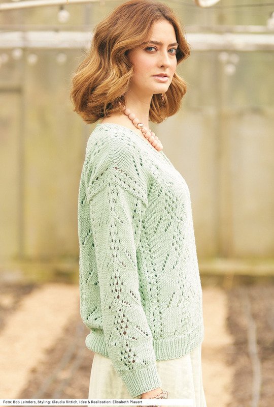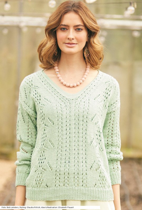 Dass Ajourmuster ganz unterschiedlich daherkommen können, beweist dieser lindgrüne Pulli** aus einem Baumwolle-Viskose-Leinen-Gemisch. Es gibt ein flügelartig ausschweifendes und ein längs verlaufendes Ajourmuster; wobei das vertikale Lochmuster am V-Ausschnitt entlang fortgeführt wird. Damit die löchrigen Muster gut zur Geltung kommen, wird dazwischen glatt rechts gestrickt. Saum- und Ärmelbündchen sind im 1/1-Rippenmuster gearbeitet, der V-Ausschnitt bekommt lediglich noch eine Umrandung aus einer gehäkelten Runde Kettmaschen für einen sauberen Abschluss. Die Anleitung kann für die Größen 36/38, 40/42 und 44/46 downgeloadet werden.**