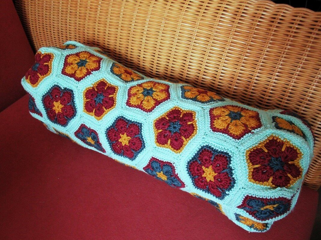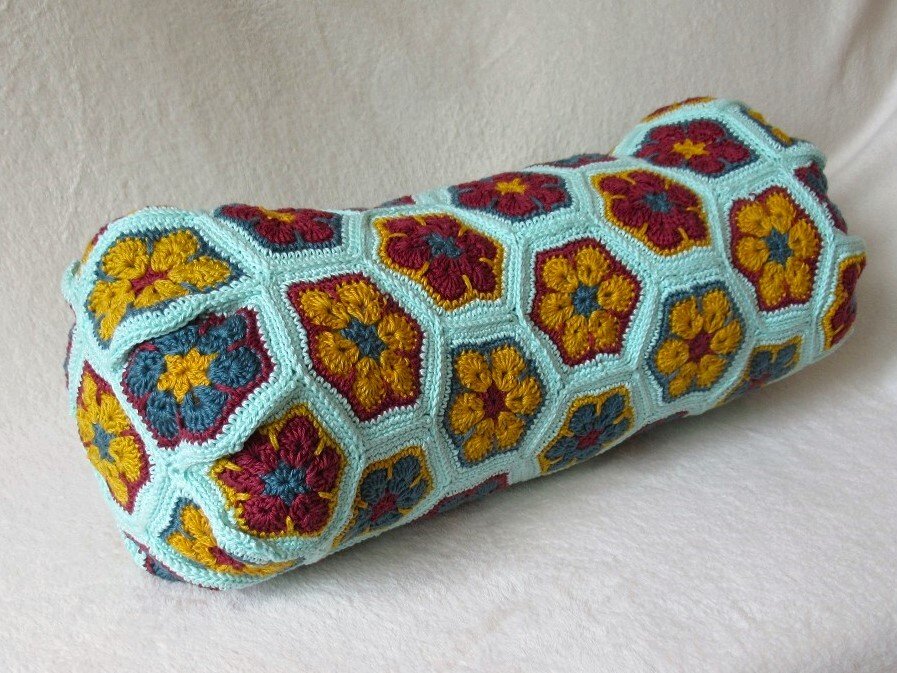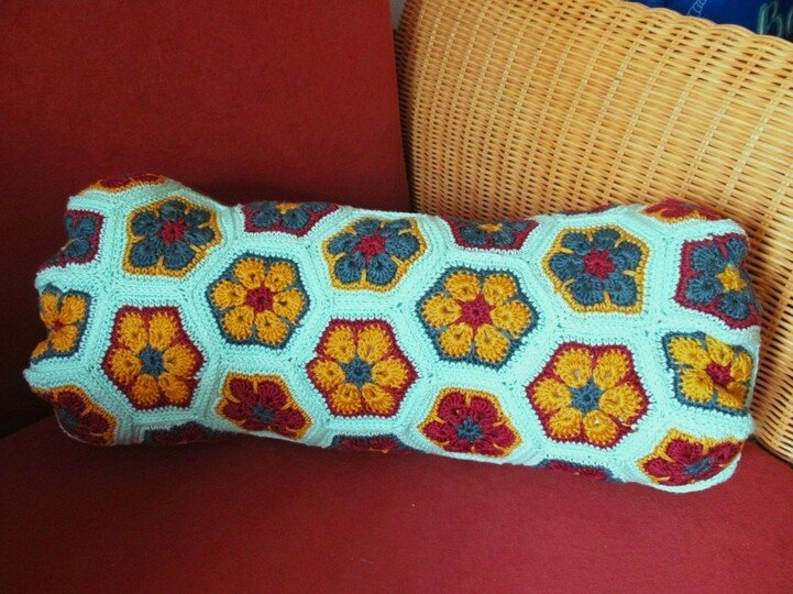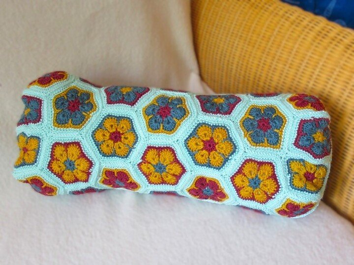 Meist findet man im Netz Nähanleitungen für Leseknochen. Der hier vorgestellte Leseknochen wird gehäkelt. Er besteht aus einzelnen Sechsecken mit Blumenmuster (African Flowers), die am Ende zusammengenäht oder zusammengehäkelt werden. Dabei ist er hervorragend geeignet, um viele bunte Wollreste zu verhäkeln.