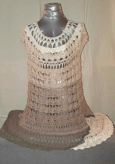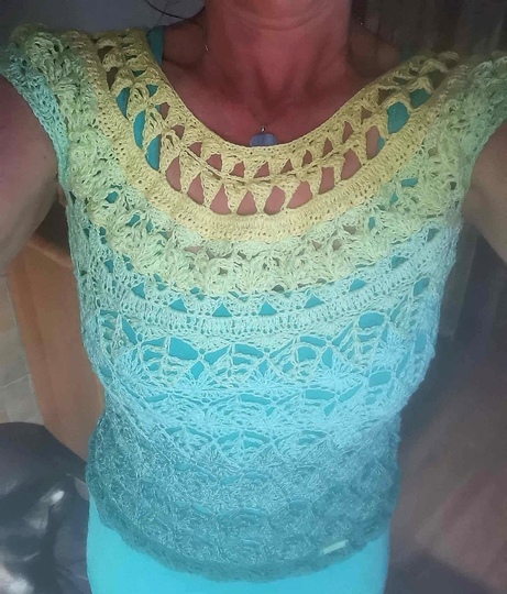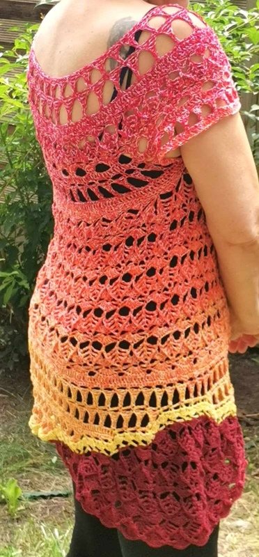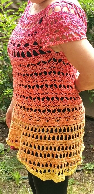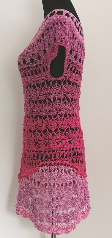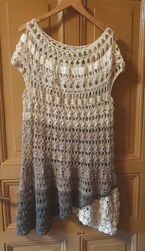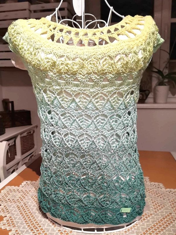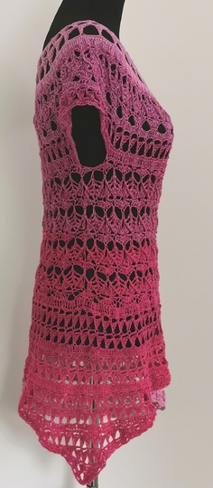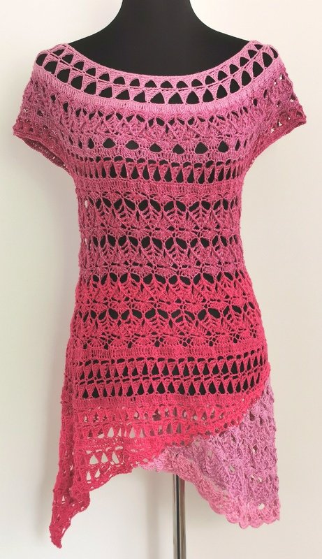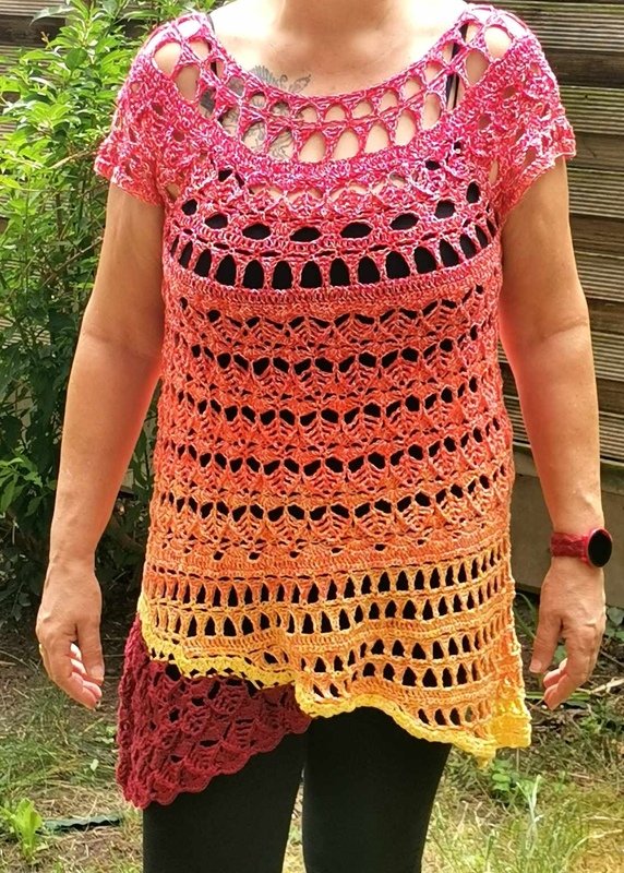 Die komplette Tunika kann mit nur einem Bobbel gehäkelt werden, man kann aber auch einen Rockteil in einer Kontrastfarbe oder den ersten Farben des Bobbels häkeln, um die ganz besondere, aussergewöhnliche Form noch mehr zu unterstreichen.