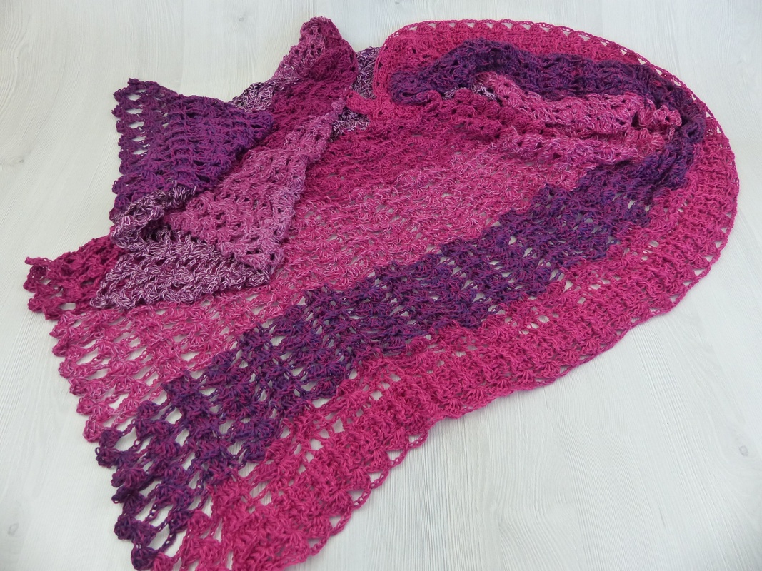 Das pink/lila-farbene Tuch wurde aus farblich zusammenpassenden Bobbelwollresten gehäkelt.