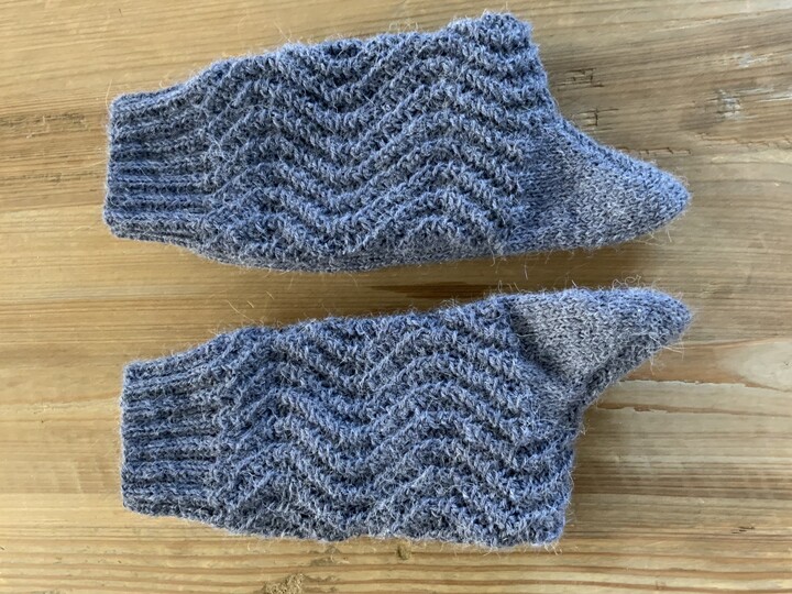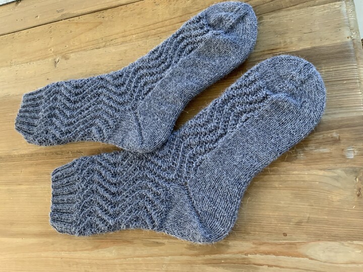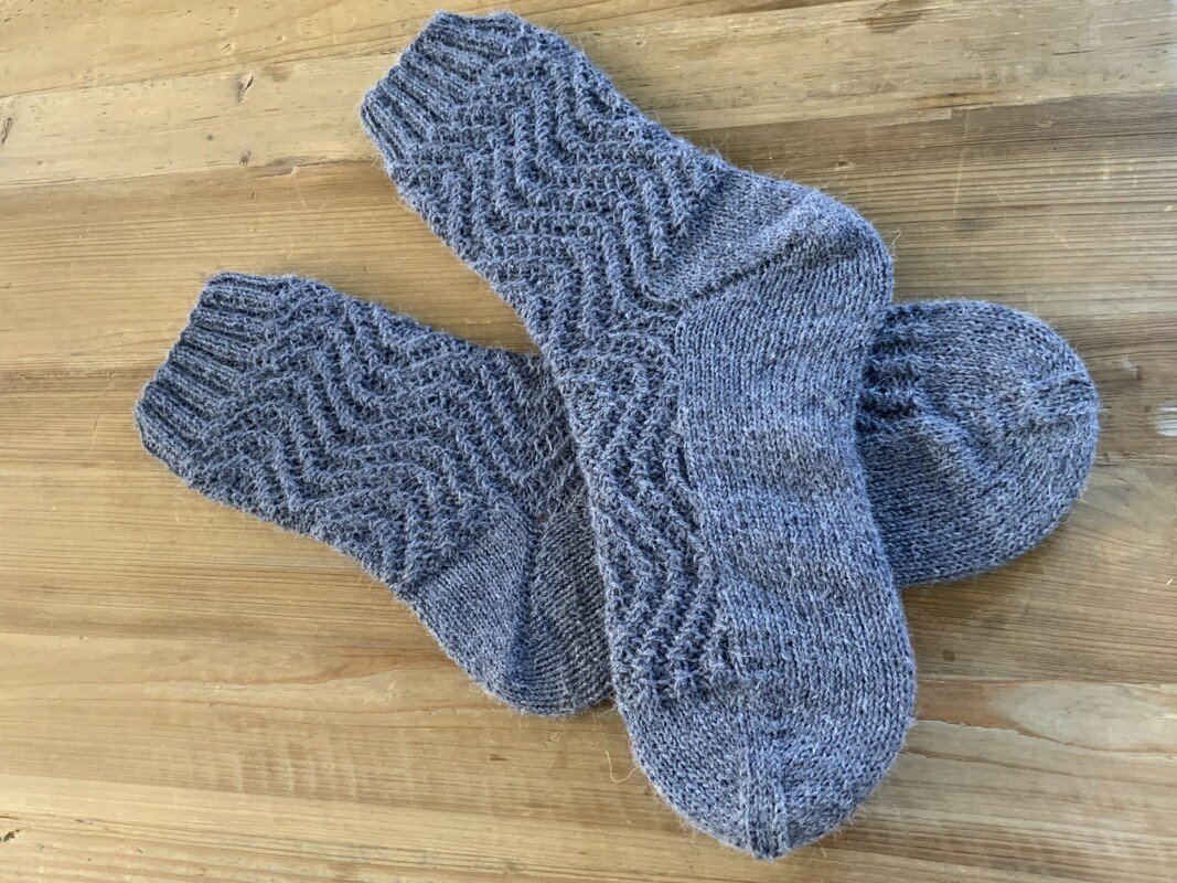 „Cato“, Socken mit einem einfachen Wellenmuster, dass durch überzogene Maschen entsteht. Die Socken werden von oben nach unten gestrickt. Ich habe die Ferse als Bumerangferse gearbeitet und eine Bandspitze gestrickt und beschrieben. Ferse und Spitze können jedoch auch anders ausgeführt werden.