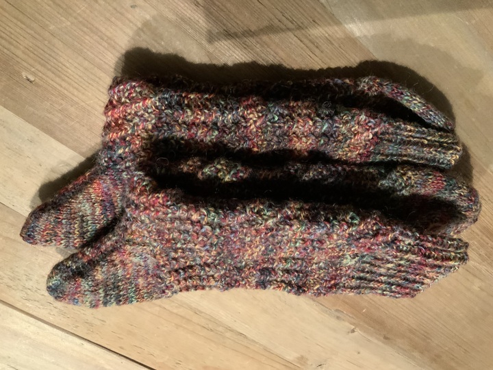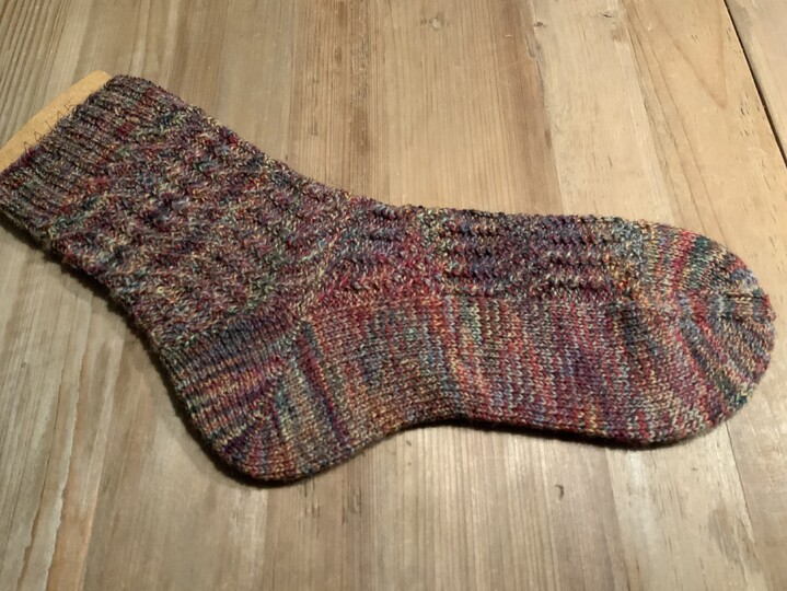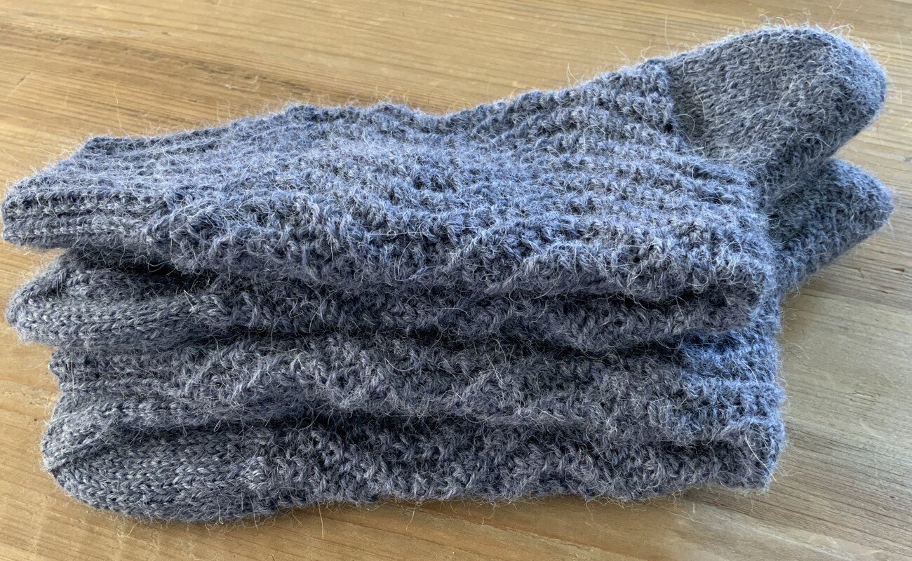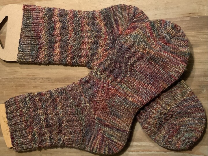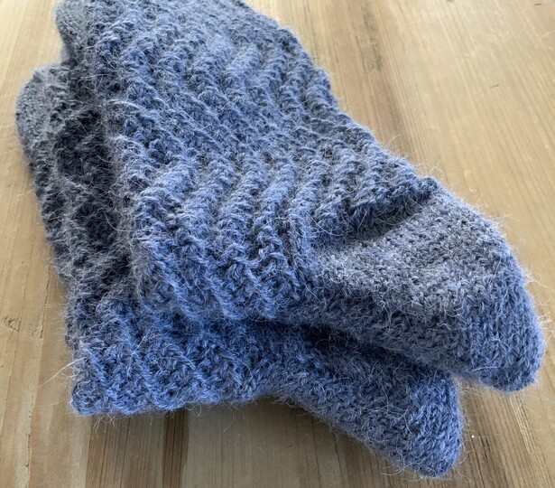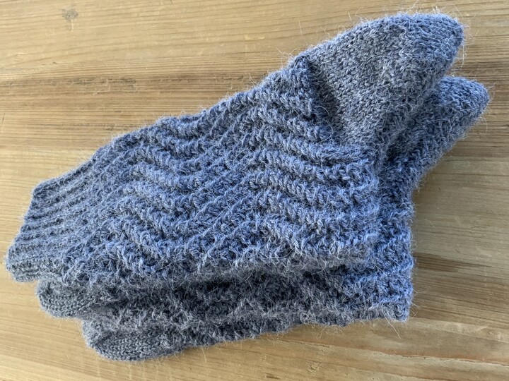 Die Mustersocken – meliert (links) sind aus Sockenwolle von Myboshi, mysocks , in der Farbe Nylund [75% Wolle, 25 % Polyamid], Maschenprobe: 30 Maschen, 42 Reihen glatt rechts