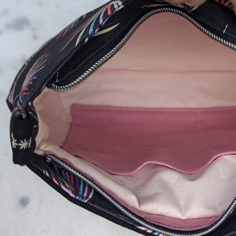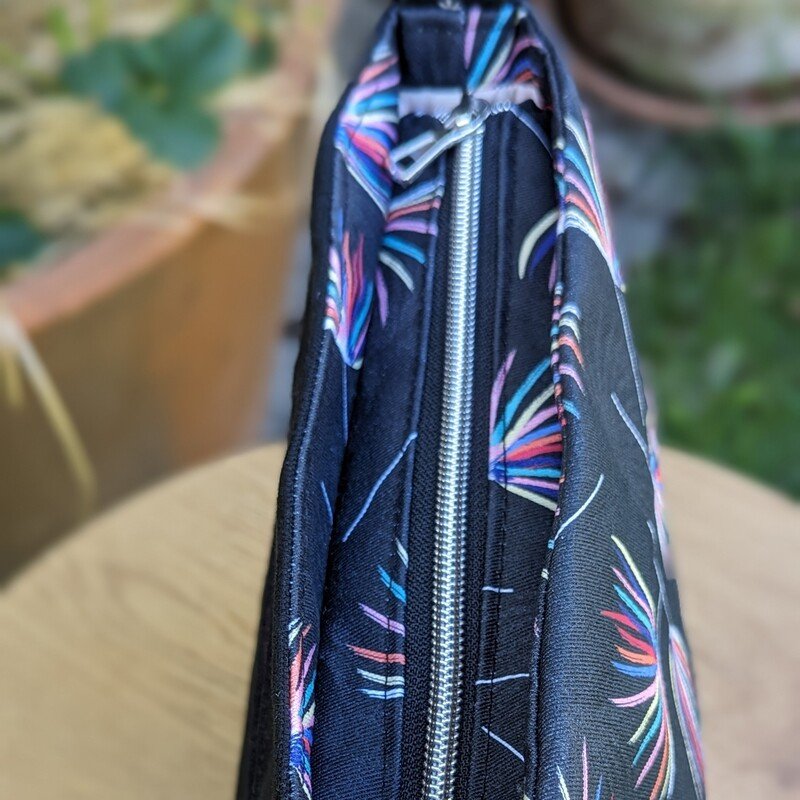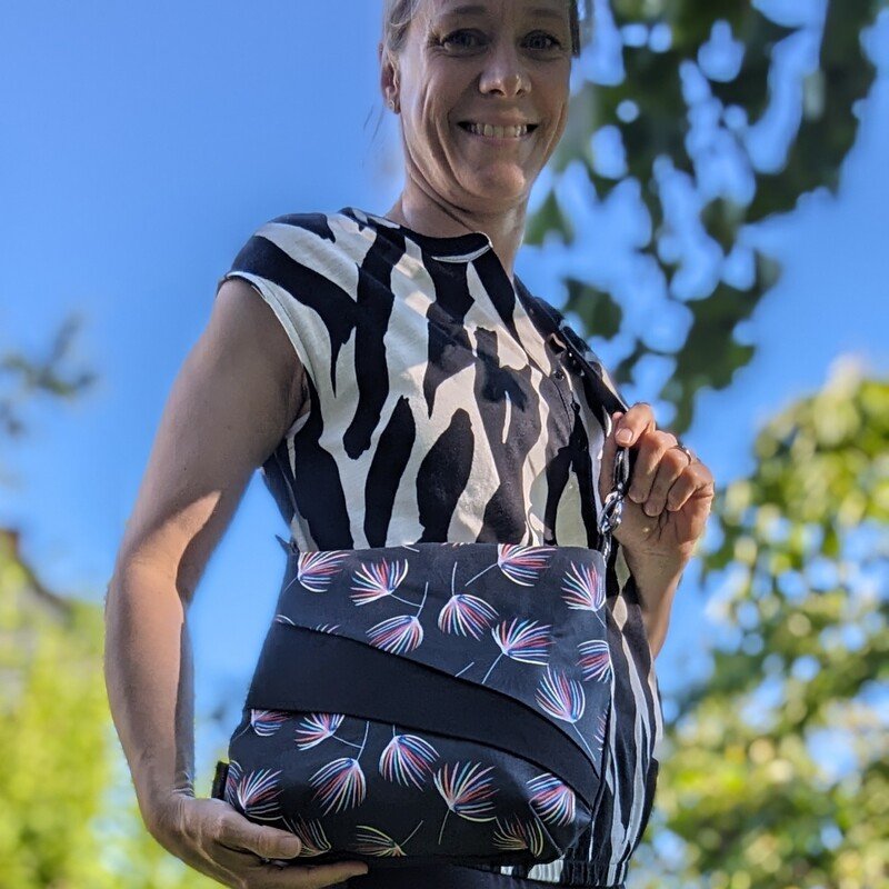 „Hana“ ist eine geräumige Umhängetasche, die ca. 27 cm hoch und an der breitesten Stelle ca. 31 cm breit ist. Die Tasche wird mit einem innenliegenden Reißverschluss verschlossen, sodass der Inhalt gut geschützt wird. Die Faltung der Stoffe auf der Vorderseite verleihen der Tasche das gewisse Etwas. Hier lassen sich Stoffe besonders gut in Szene setzen. An der rückwärtigen Außentasche kann eine kleine Reißverschlusstasche eingearbeitet werden, damit kleinteilige Dinge, wie beispielsweise der Hausschlüssel auch sicher verwahrt sind.