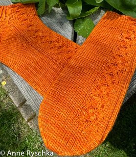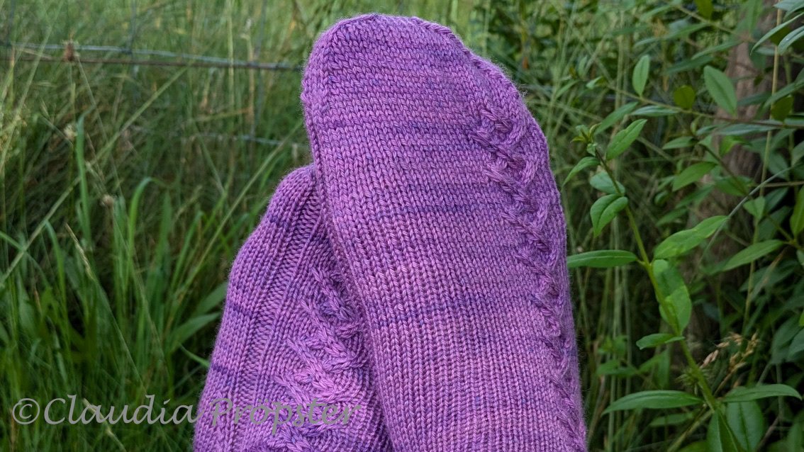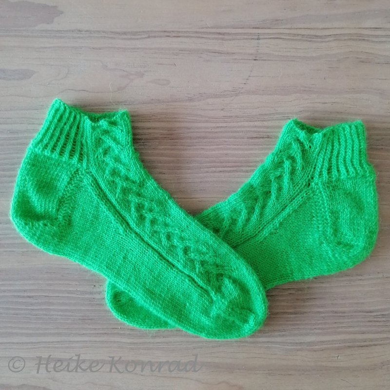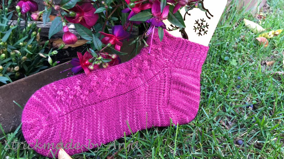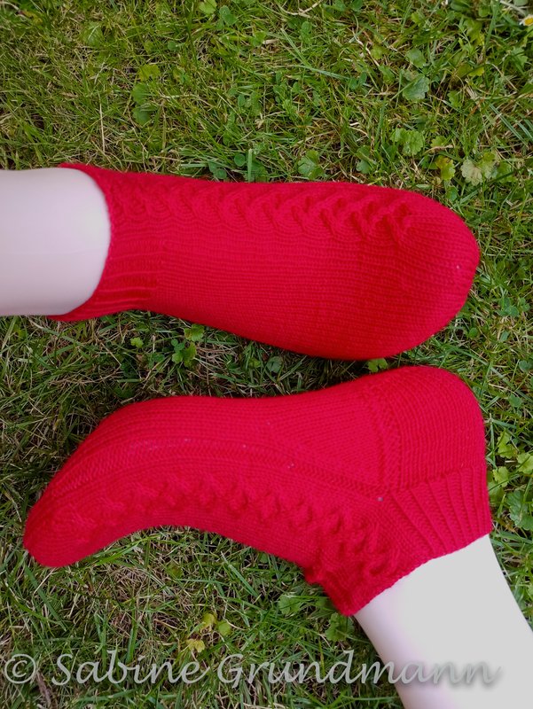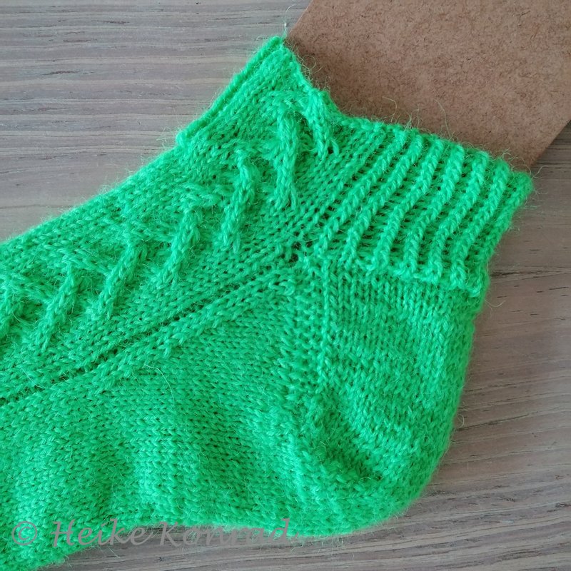 In dieser Anleitung ist das gezeigte Bündchen, die Hufeisenferse und die Bandspitze beschrieben. Es kann aber beliebig ausgetauscht werden.