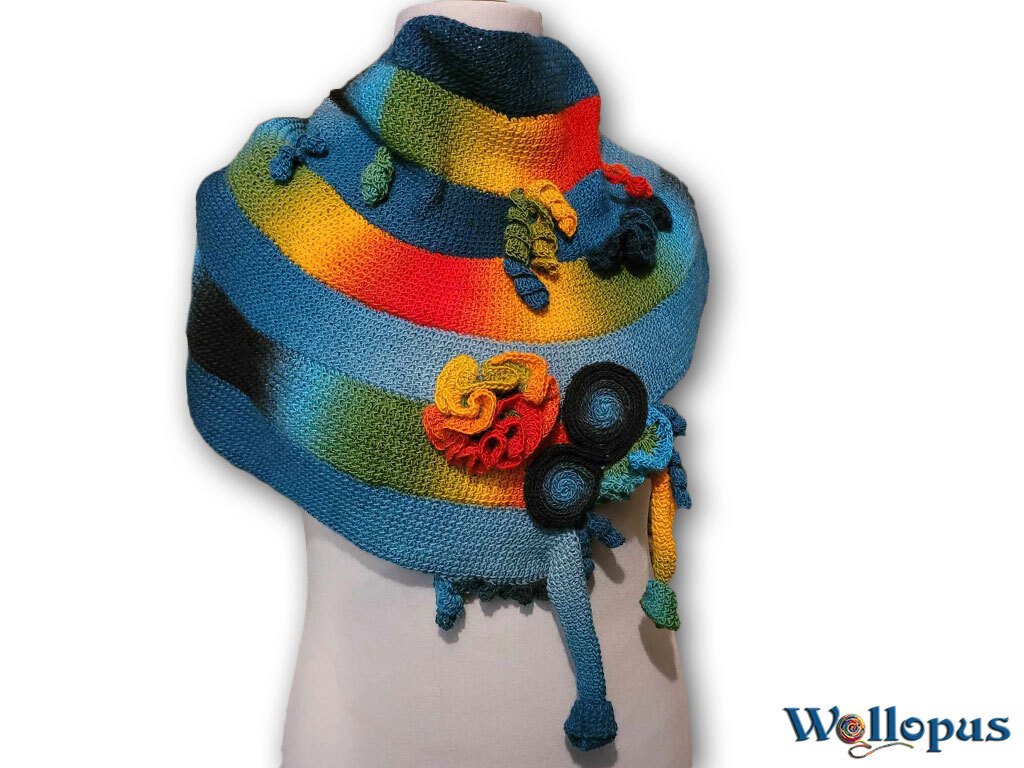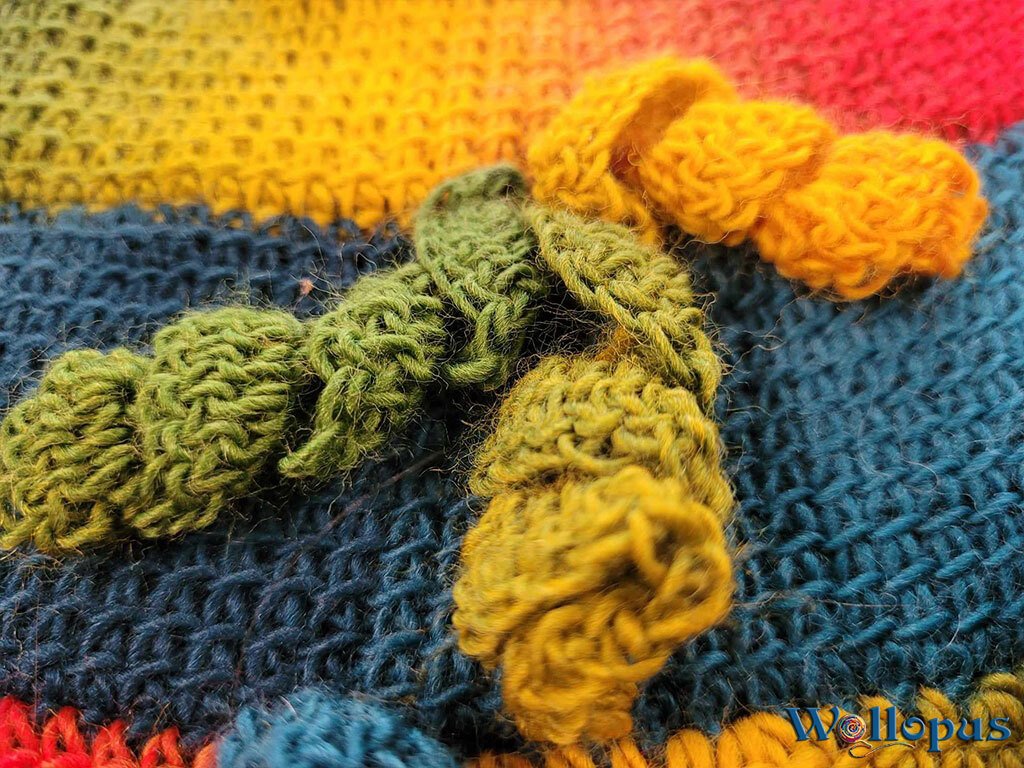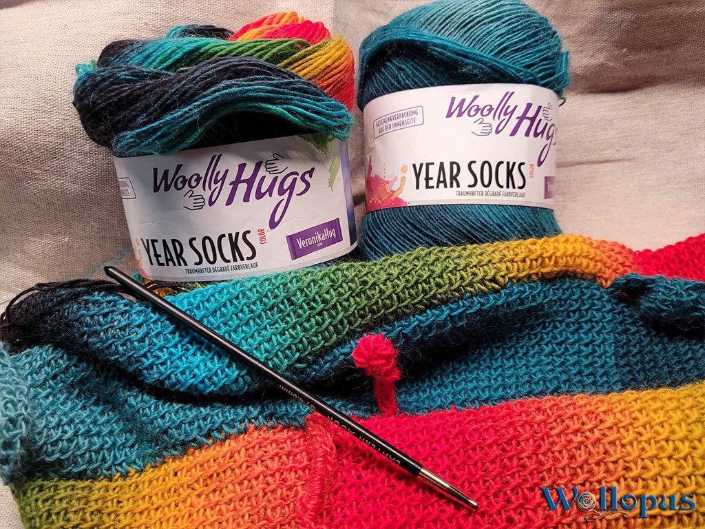 Dieser Noose-Loop ist ein wahres Farbenfeuerwerk! In fröhlichem tunesischem Häkelmuster, gefertigt aus den beliebten „Woolly Hugs Year Socks“ in Regenbogenfarben und Petrol, präsentiert er sich als einzigartiges Accessoire. Die besondere Optik entsteht durch die zweifarbige Verarbeitung, die einen faszinierenden Doppelhelix-Effekt erzeugt.