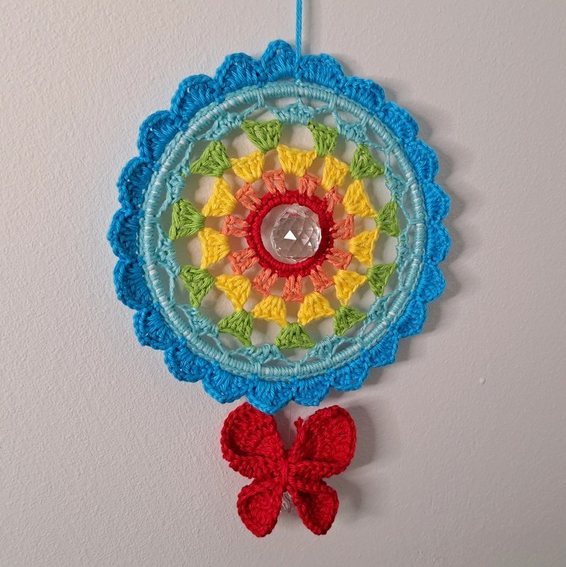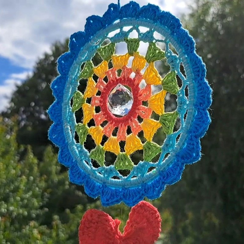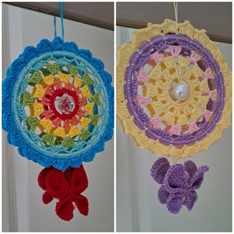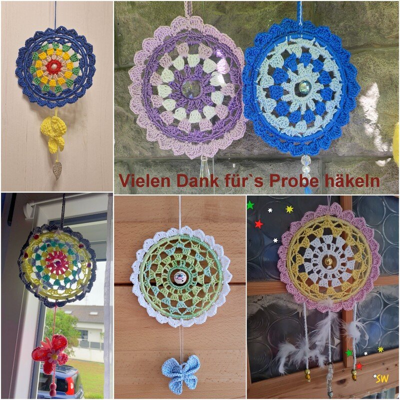 Die Basis der Sonnenfänger besteht aus einem Granny Mandala. In der Mitte können wahlweise Kristalle, Perlen oder andere Elemente angebracht werden.