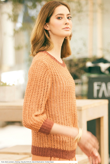 Ein einfaches Lochmuster in Apricot und rostfarbene Bündchen sowie Ausschnittblende wirken schlicht und dennoch elegant. Eine warme Farbkombi mit ruhigem Charakter. Alle Bündchen sind im 2/2-Rippenmuster gestrickt. Die Ärmel haben eine Armkugel, sodass sie sich perfekt den Schultern anpassen. Gearbeitet wird mit einem Garn, das neben Schur- und Baumwolle auch Yakwolle enthält. Das einfach zu strickende Muster verspricht auch AnfängerInnen, die schon mal einen Pullover gestrickt haben, Erfolg. Die Anleitung hierfür kann in den Größen 36/38, 40/42 und 44/46 downgeloadet werden.