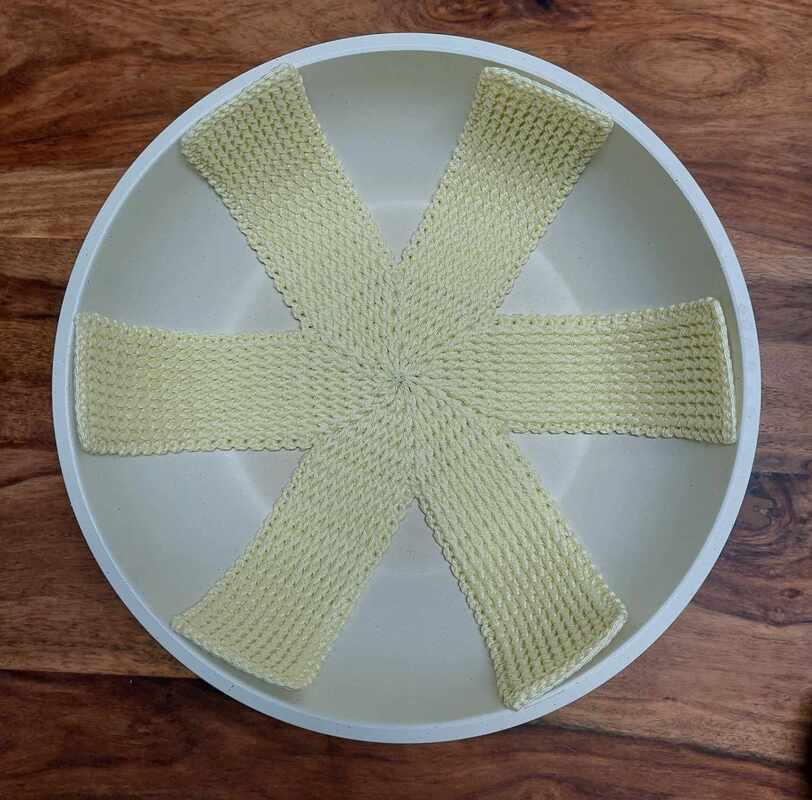 Gehäkelt werden feste Maschen, Stäbchen und Reliefstäbchen.
